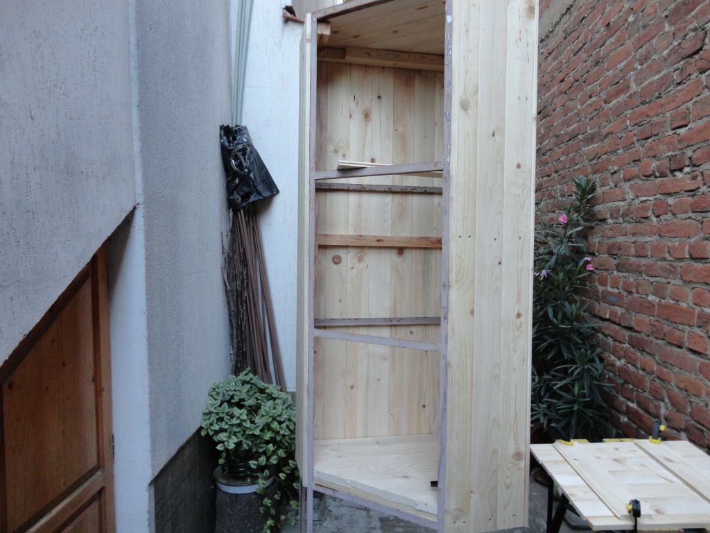 Грифин, вярно, че е леко нестандартна, по-висока и с тясна основа, ама нали бабичка ме къта :-D :lol: , се погрижих и за това.Намерих две пети от акумулираща печка, заварих им по една шпилка, заварих по една гайка на основата и сега като се намести кулата, петите се натягат леко към земята и работата се застопорява. Анонимен1, колелетата ги взех от кварталната железария, 160 кг товароносимост имат, на един лагер са.А закръглението на долапа го очертах, минах го зъз зеге-то и после на барабанния шлайф го изравних по диаметър.Ето от днес - затворих долапа със сачака и останаха вратичките.Едната вече съм я заложил да залепва.Този път реших първо да залепя страниците, да не си играя да гоня размерите в движение.Така ще навия утре видиите в готовата врата, само трябва да и оформя другия габарит, единия е готов.