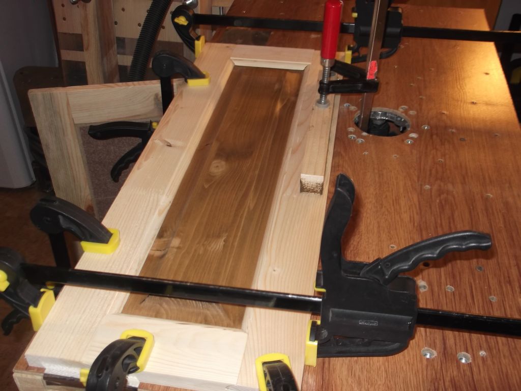 Направих двете вратички за шкафа от новите мебели.Не съм ги монтирал още, но и това ще стане.Материала е пак дървен слепен плот, оразмерен със зеге-то, малко профил на оберфрезата и дръжките от собствено изработения профил.