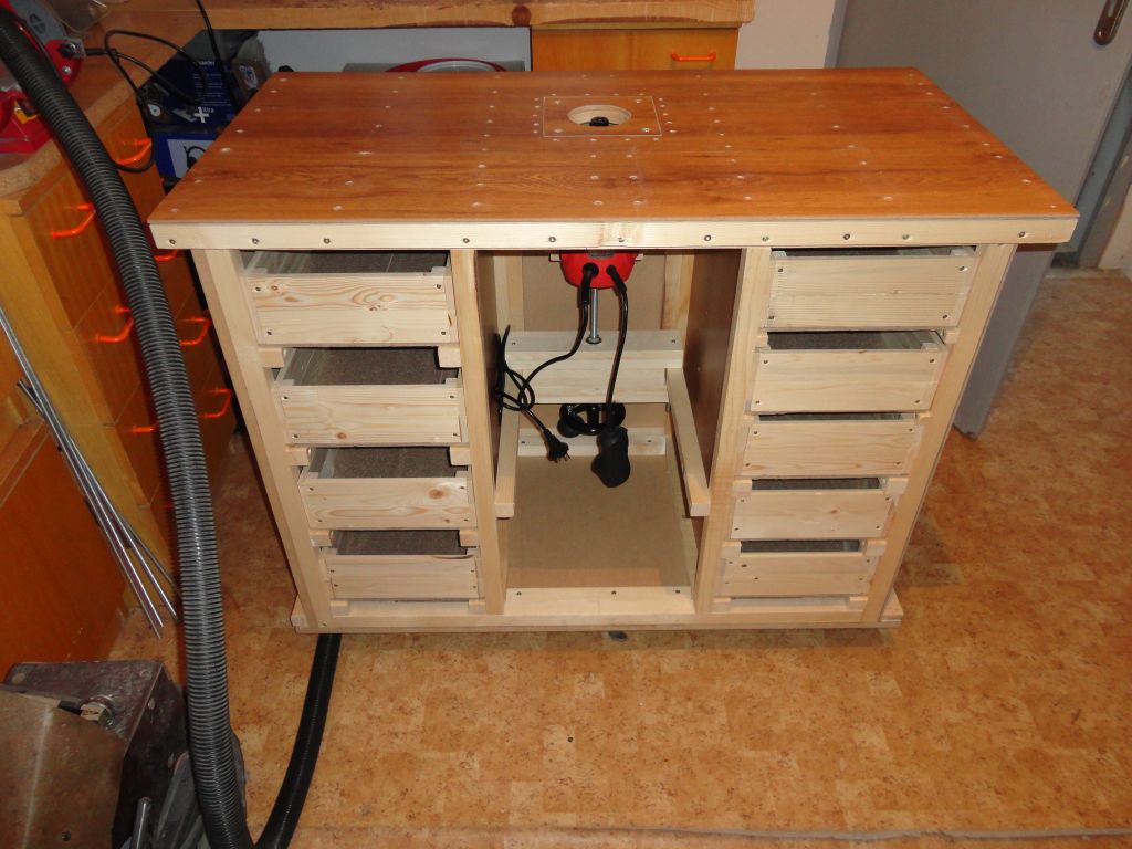 Ами напреднах, ама още има.Нямам още водеща шина за детайлите и разни други такива, но вече ми писна да стоят двете маси една върху друга и я свалих.Поне като тезгях си я ползвам вече. :lol: Старата я разглобих и ще отива на вилата, там има работа за нея.До есента се надявам тази да я довърша съвсем.