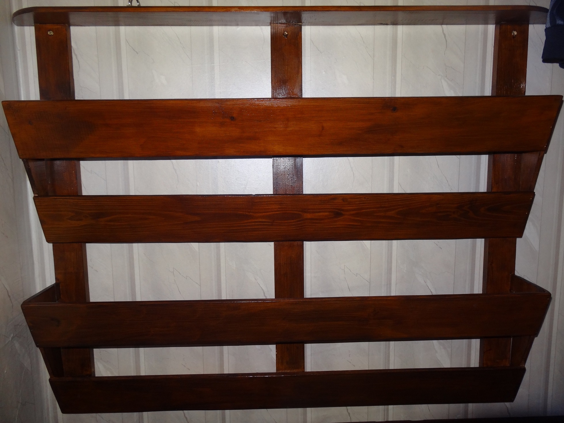 Бяха доста интензивни последните 4-5 месеца и не оставаше много време за хобито. Но все пак откраднах 3-4 часа от миналата Неделя за да се опитам да съживя един доста стар палет, подарен ми от приятел. Май се получи, но пиша чак сега защото жена ми до мина 4 ръце ( 2 байц и 2 лак ) и чак снощи го монтирах. Има забележки, но все пак е остпадъчна дървесина:-). Не успях да снимам процеса на изработка, но бях ограничен с времето.