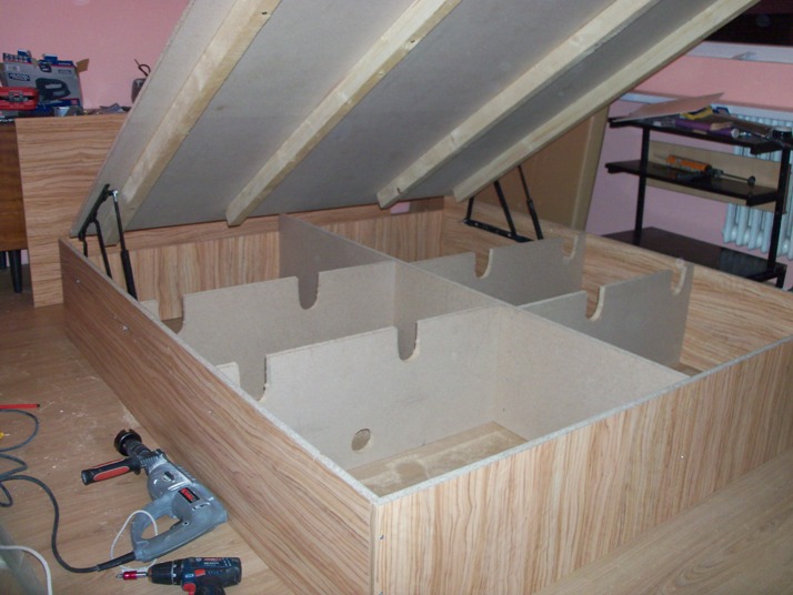 Добре би било, да захванеш механизмите за рамката, а не за плоскостта! Сега пак ще има вероятност да се откърти, като сложиш и матрака отгоре! Ако ще правиш отвори с боркороната, съвсем ще намалиш здравината и ще са необходими и греди в другото направление, за да не се огъне и счупи по средата от тежестта на матрака. Ако има повече отвори, няма да е лошо да сложиш и още прегради на "долапите" , за да поемат тежестта като легнете! Много несериозно си подходил като конструкция и избор на материали!