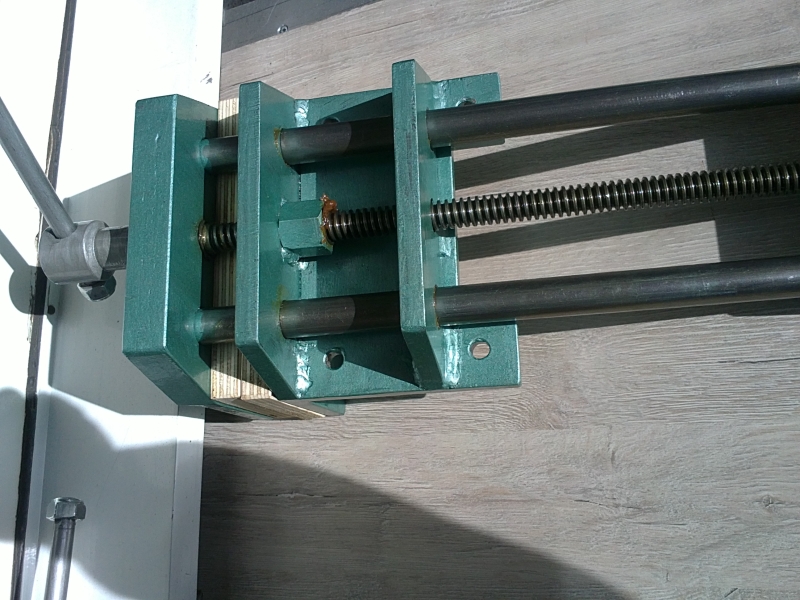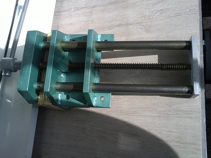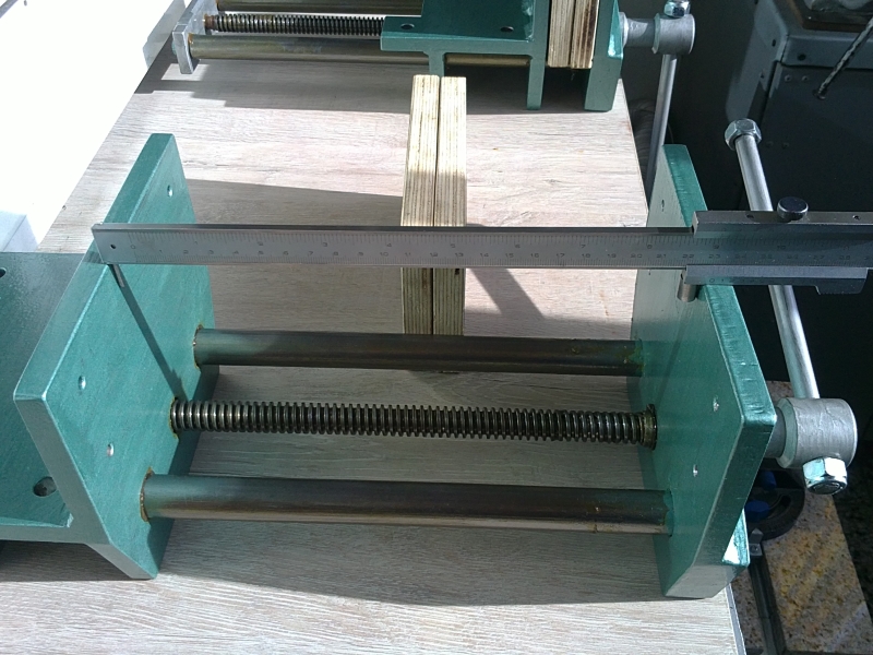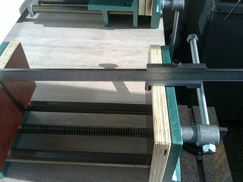Припаснах челните плочки от кофражен шперплат за да прилепват плътно, без луфт. С дисковия шлайф и едно малко ренденце се получиха нещата. И ги захванах с винтове на място. Последно боядисах кантовете на кофражния шперплат за да не дърпат влага с двукомпонентен полиуретанов лак за паркет. Без челата се отварят на 23 см челюстите, с челата отваря до 19,5см. Кажи речи 9 инча стана, това може да се увеличи с преместване на задната опора напред към винта.