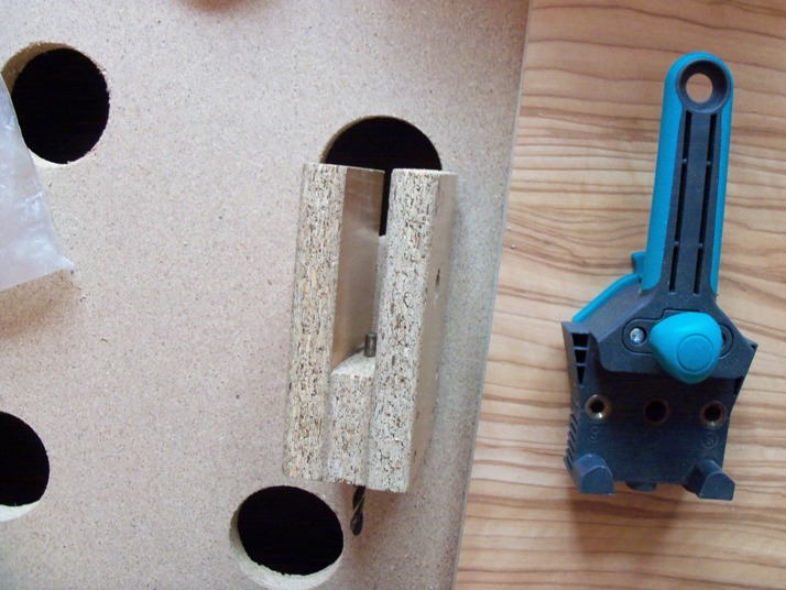Проекта още не е завършен. През деня работих из двора, та вечерта се хванах малко да подовърша по спалнята. Не свърших много. Направих си едно приспособление за пробиване на отворите за минификс от три парчета ПДЧ. Ако не е ясно от вида му- ще дам разяснения. Идеята е да се пробие отвора Ф15 за "бъчвичката" на минификса на нужното отстояние от ръба на плоскостта и съосно с отвора Ф7, през който минава винта.