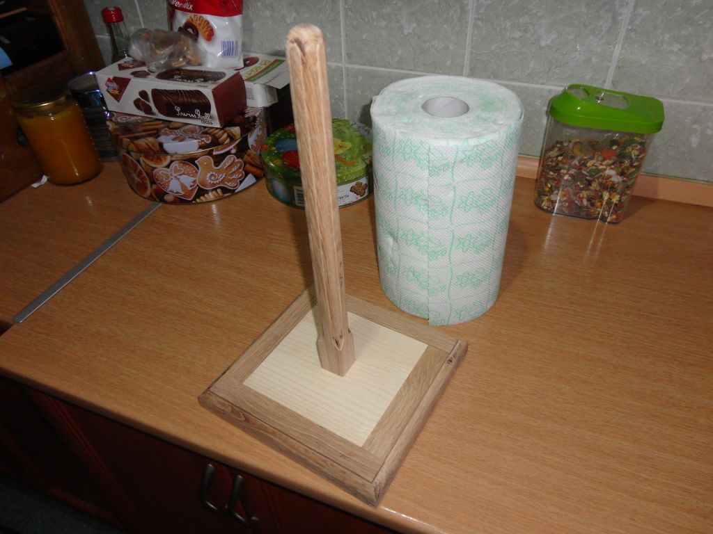 Благоверната от доста време иска да и направя една стойка да си държи рулото с кухненска хартия и днес ми остана време.Намерих малко отпадъци из работилницата.Основата е парче чам 22 мм оформено като квадрат на герунга.Обкрайчено е с изрезки о дъбово дюшеме, също изравнени на герунга и залепени с лепило като кант.Шиша е парче дъб, също остатък, оформено с оберфрезата за малко търговски вид. :lol: На основата ударих една стружка на оберката.Не е лакирано ,само шлайфано, така ще го оставя.От долу шиша е хванат за основата с един винт за дърво.