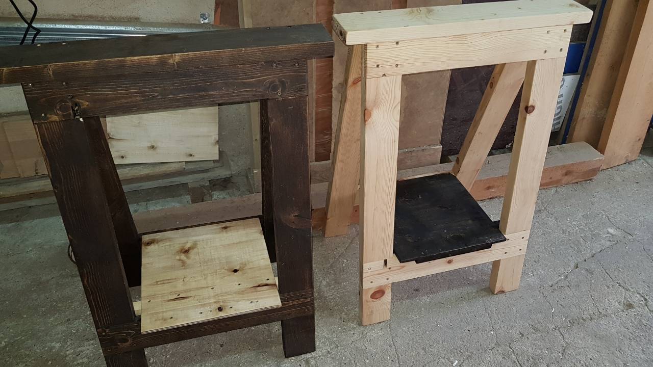 Днес в дъжда, нямаше никаква работа в офиса, та колегата ме пусна да си довърша сгъваемите магаренцата. От 2 години се каня да си направя помощни магарта, и все не остава вртеме, но сега се налага да си направя сгъваема маса за офиса и идеята е да е 2 магарета с плот, да можем лесно да я прибираме вечер и да не е много претенциозна, защото на нея издухваме от прах прашни машини. И нали не съм много опитен, реших първо да си направя за работилницата магарета ( така или иначе след време няма да приличат на нищо ), ако нещо объркам или не се получи. И вече другите да са по- .. уж хубави, за това и тези са по-шарени и не чак толкова доискусурени. Финиша е само масла ( на светлото, долния плот е с цвета на тъмното, но маслото още попитва ):