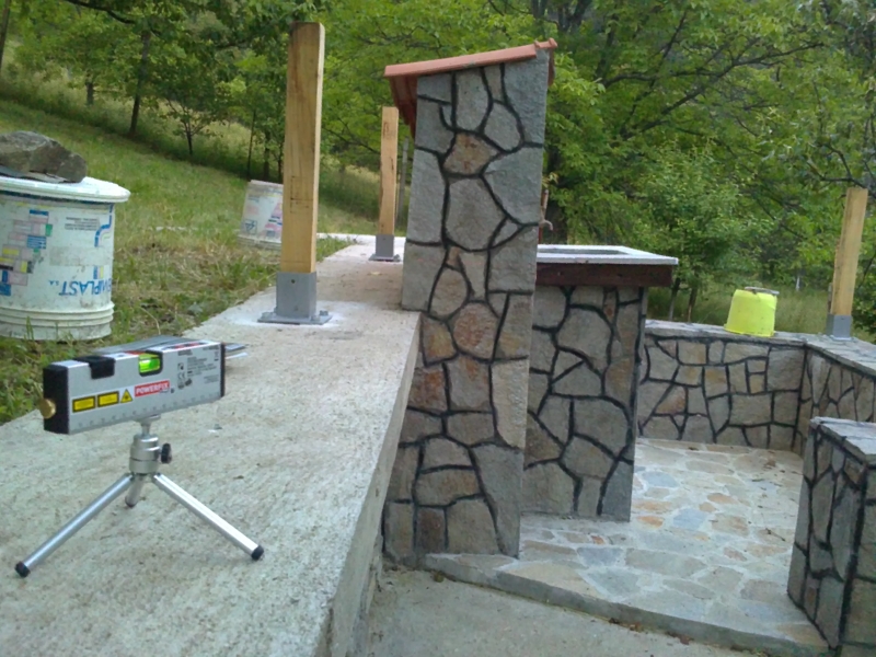Основите са с размери 2метра на 218. Покрива е с дължина 315 и широчина 180 на единия скат. наклона е към 30 градуса. Материалите които отидоха за изработка са 6 греди 8х8смх4м(колони, било и подпори), 4бр-8х10 смх4м(хоризонтално укрепване и конзолки) , ребра 8 броя 12х6 смх4м остана 1бр, 5 челни дъски 19см по 4м(стана една) и 5 пакета дюшаме(50бр) 7 х2,5смх4метра(не стигнаха 4 броя и се наложи да довършвам с парчета).