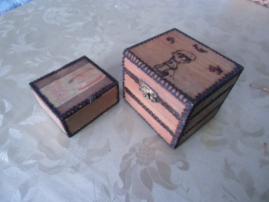Започнах с тези две кутии и то само по ръбовете,като на едната имаше картинка и повторих и нея: За вчера се бях подготвил с няколко снимки,които принтирах,черно индиго ,което беше главното ,защото се сетих ,че с него мога да копирам изображенията върху кутиите.В някой от отговорите видях ,че и колега така е постъпил,но бях вече направил горната страна на кутията ,а тя беше такава :