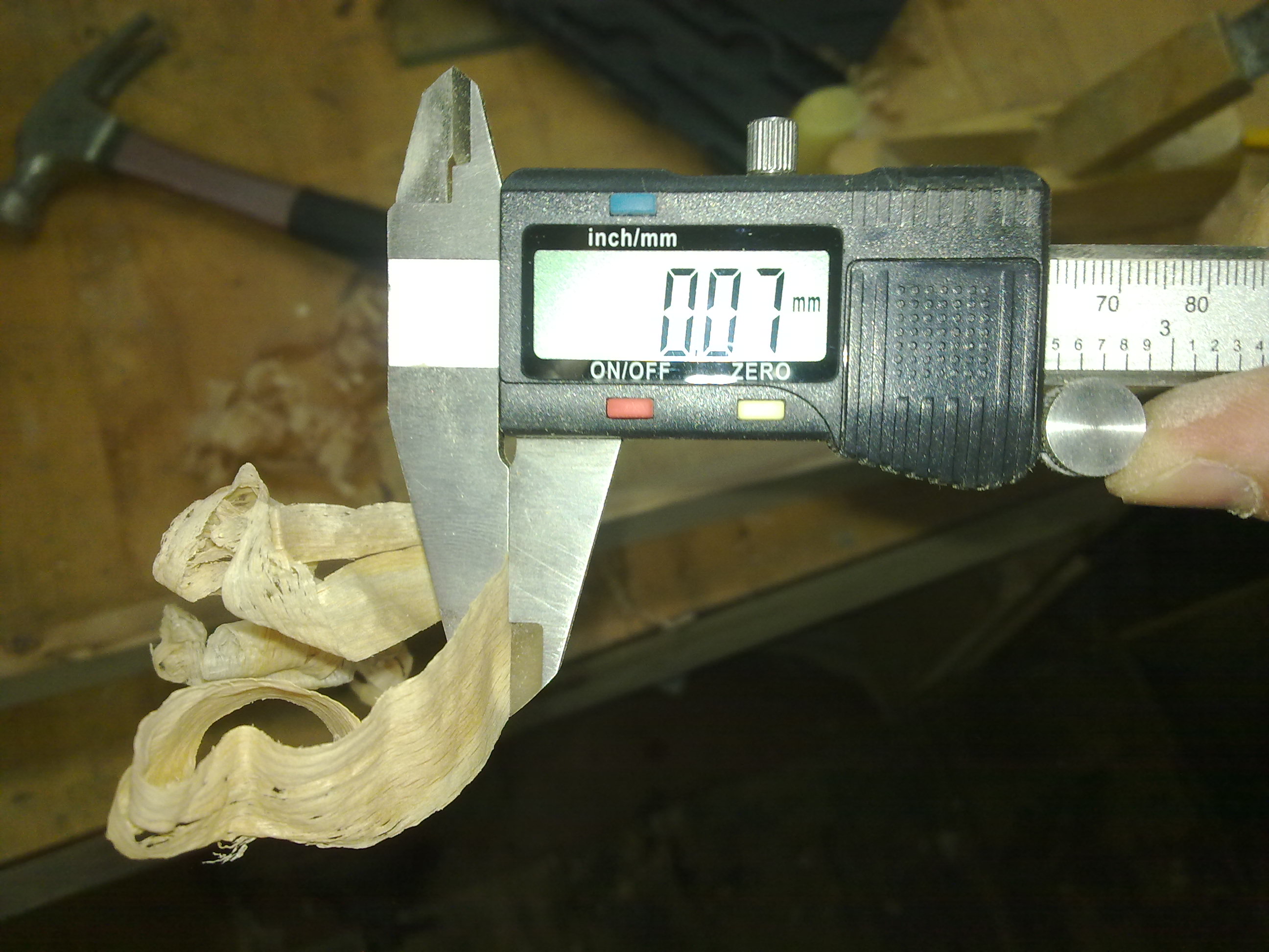 Досега бях в гаража и наострих и полирах ножа на дървеното ренде, настроих го и започнах да експериментирам каква е най-тънката стружка, която може да свали с него. За сравнение показвам и резултати от работата с чугунени рендета "Стелни" (които нито съм острил, нито съм настройвал, нито съм полирал за експеримента).