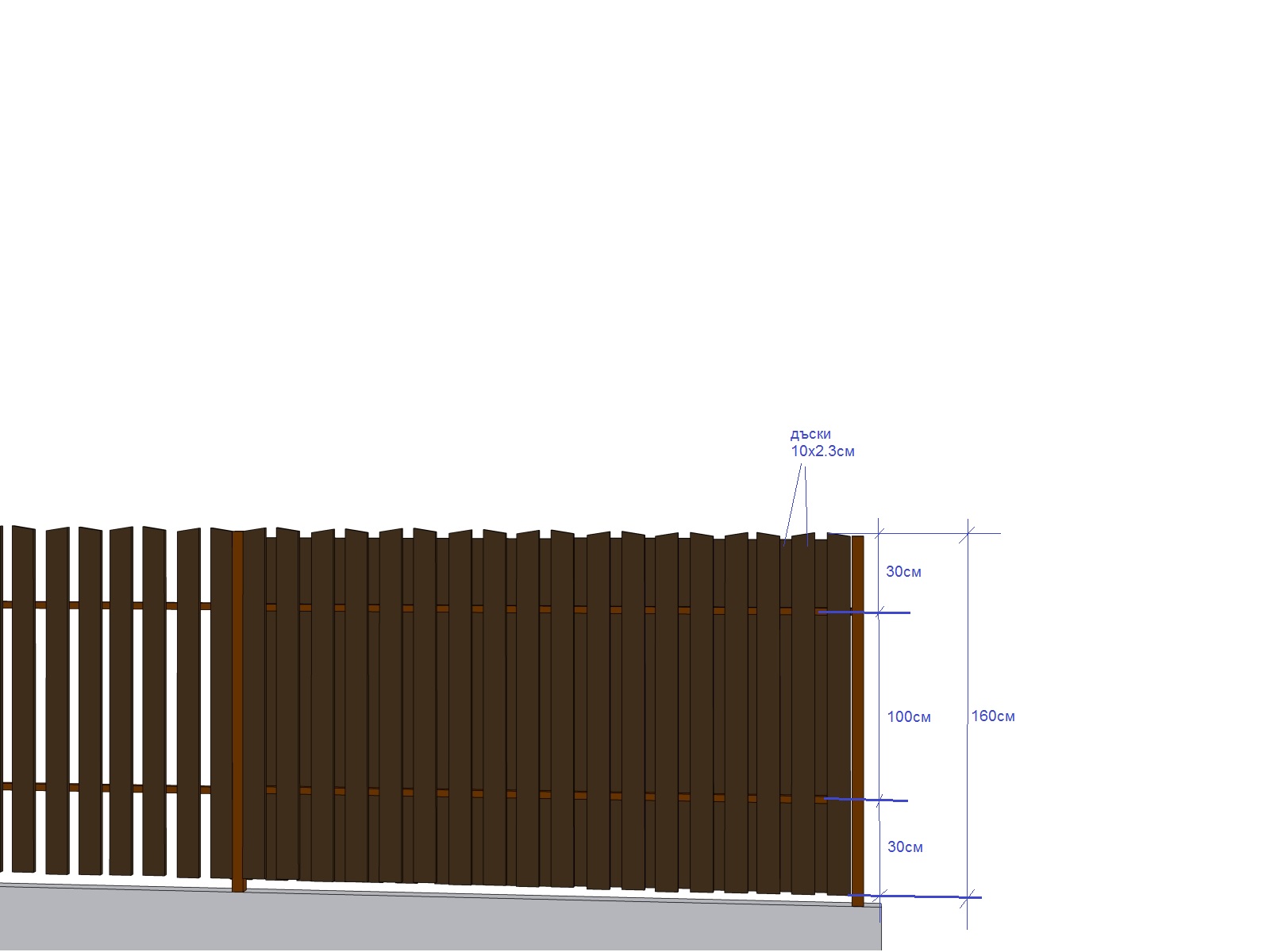 Парапета ще е нещо като на картинката. За него ме вълнува дали ще има склонност да провисне при така дадените разстояния и дебелини на материала. Конструкцията съм я мислил така, че да не е нужно фрезоване за направа на сглобки, а да стане всичко с винтове. Оградата е с 2 реда дъски, за да си огигуря видимост само в определени посоки. Чуденето ми там е за хоризонталните метални профили за които се ловят дъските. Иска ми се да мина с 2 такива, което означава че ще са през метър. Всичко съм означил на картинката. Дали ще се изметнат дъските при това разстояние? И друго питане е при 10см ширина с 1 или 2 винта да ги хващам към всяка метална хоризонтала. Ще ползвам самопробивни, а не с коларски болтове. Дъските са 500+, така че всяко опростяване е от значение.