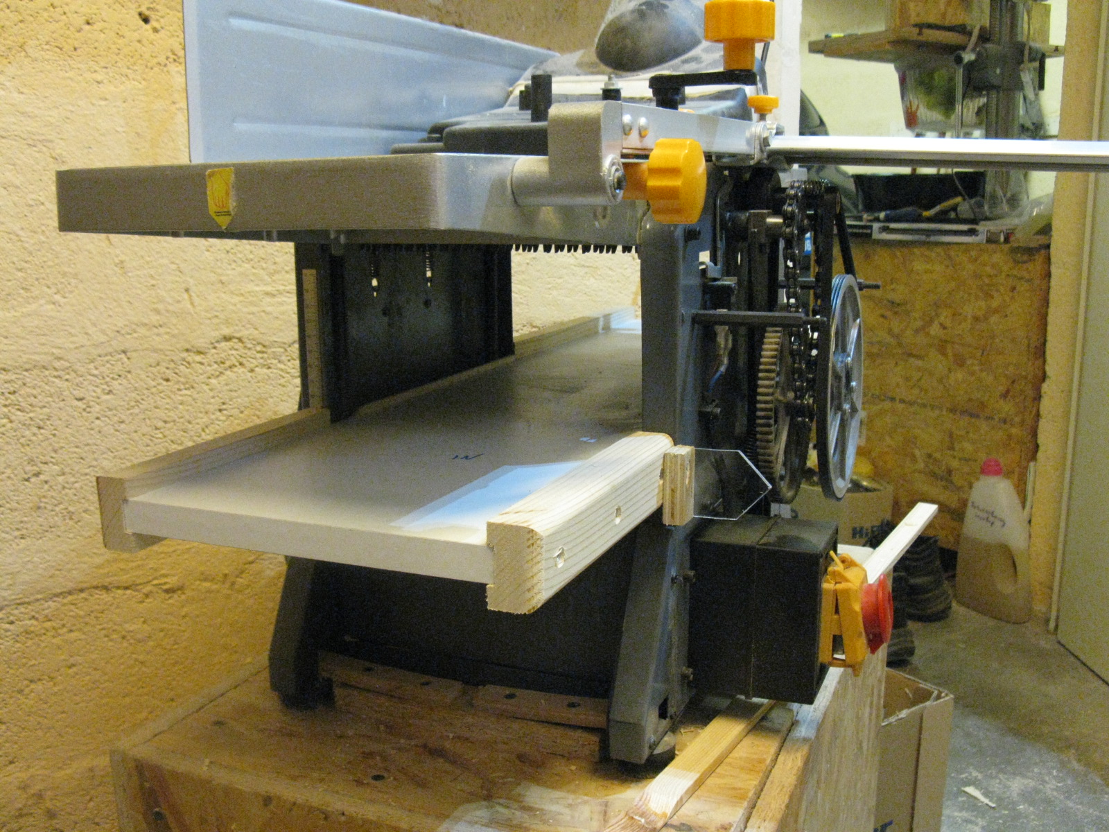 Мод на масата на щтрайхмуса, проблема ми беше че винаги се чудих къде да пъхна точно материала и трябваше да се навеждам за да виждам какво правя и на изхода поддържането на по дълъг материал беше проблем а няма кой да ми придържа ето масата която напъхах върху оригиналната масичк на машината. Плоскостта има ограничители за ширината вътре за да не отива материала към винтовете от едната страна има винтове оставени за да може да се вади масата при необходимост. Масата е закрепена към основната с две скоби които осигуряват да не мърда на никъде. Чамовите летви са за стабилност на ПДЧ-то едните са залепени и заковани другите само завинтени.