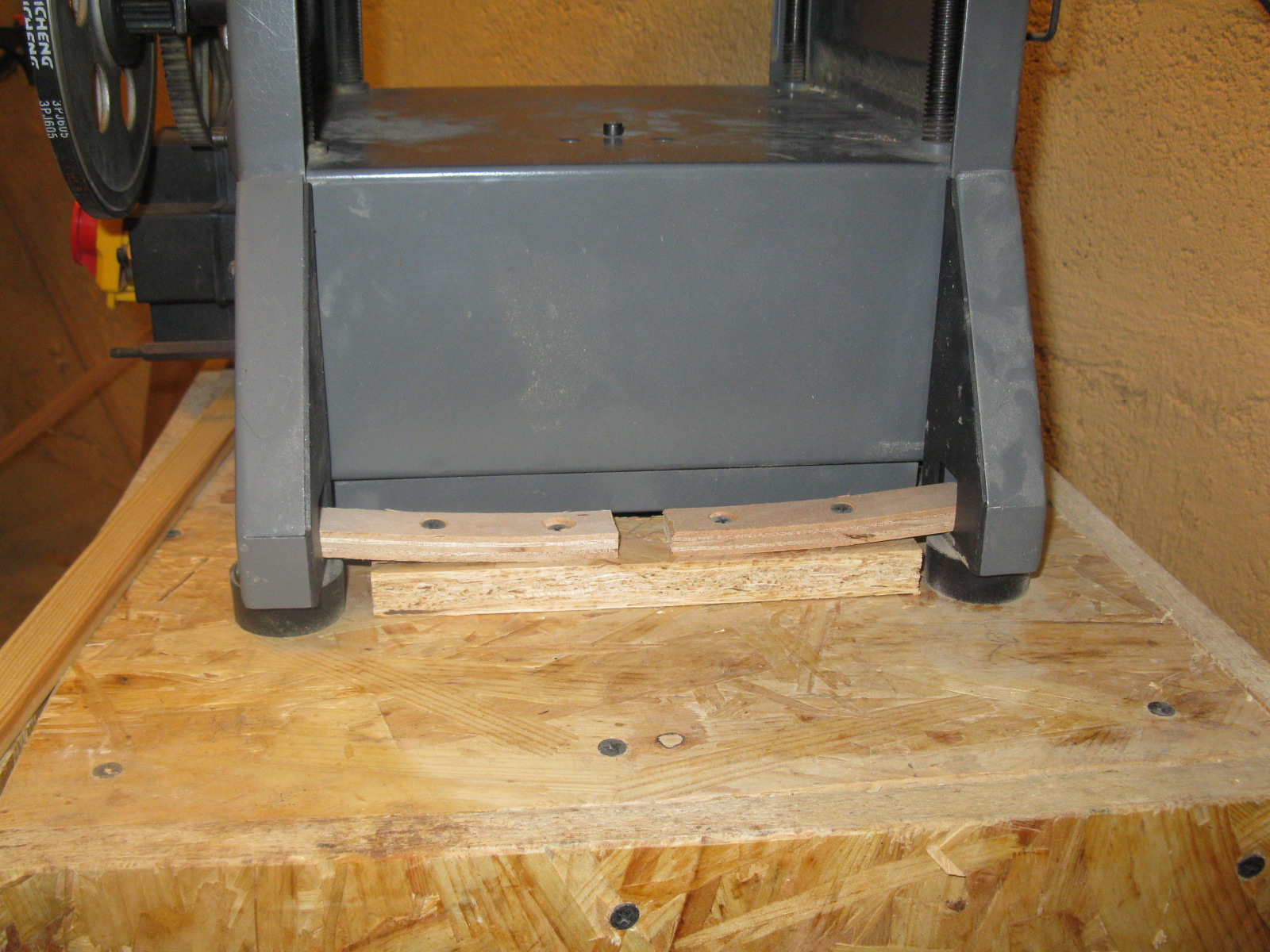 Следващото е луфт в подаващата маса на абрихта проблема е че при промяна на отнемането краищата на масата не бяха на еднакво разстояние и трябваше леко почукване. Добавих прижини на настройващия винт които осигуряват постоянен натиск на масата и гпре долу отстраняват проблема, по силни пружини биха действали по добре но това имах.