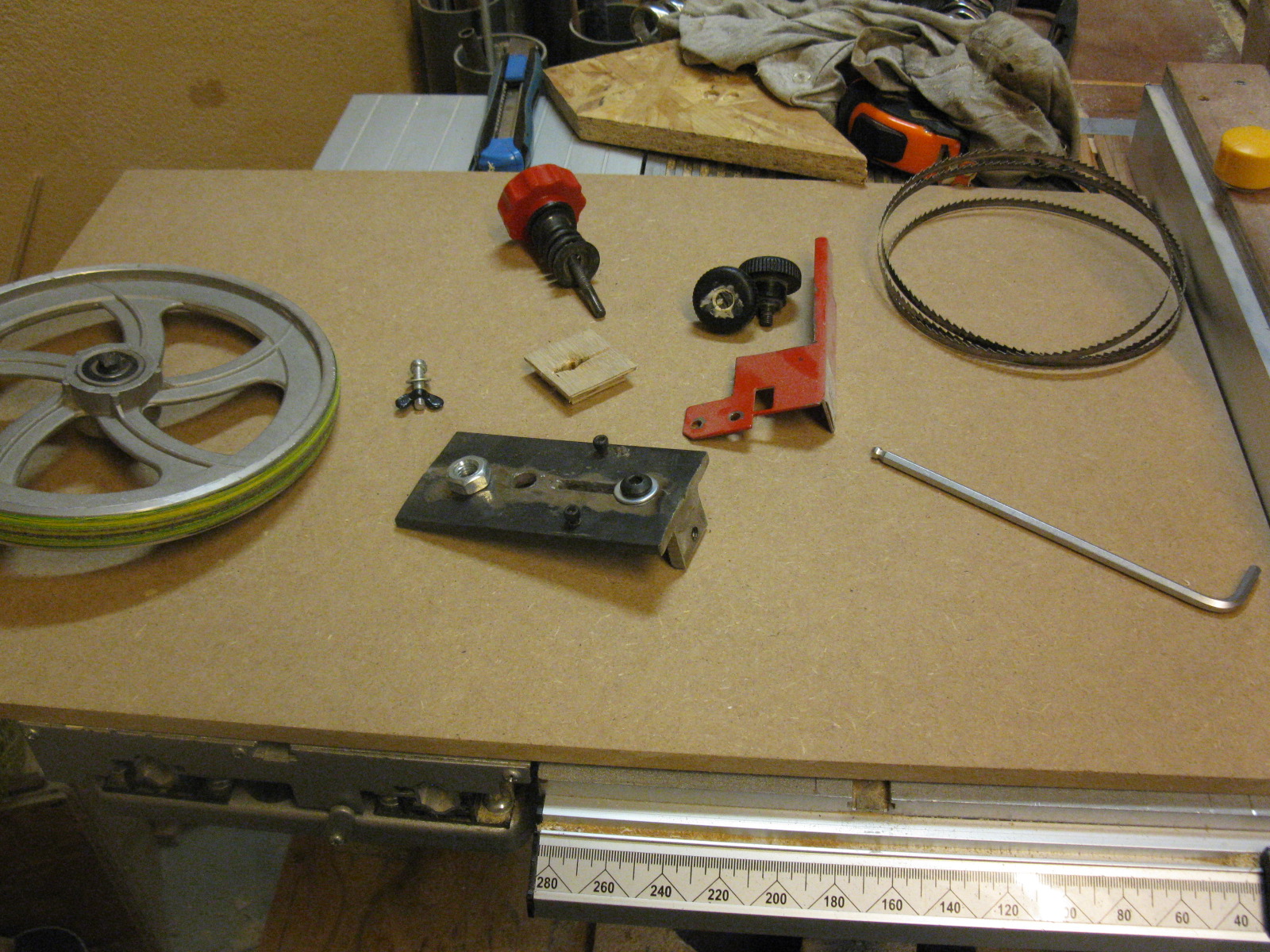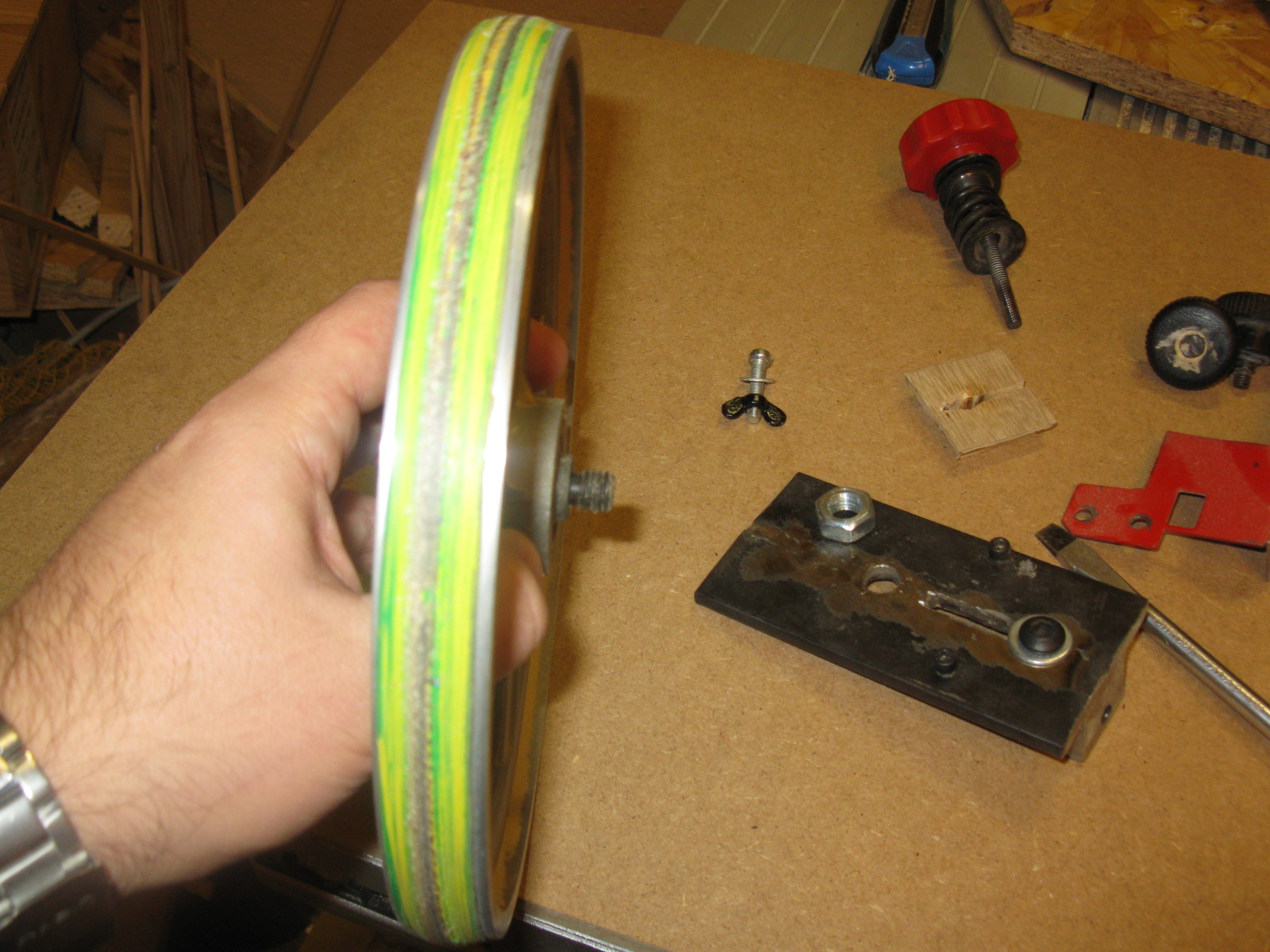 След това забелязах че при работа лентата се гъне съответно я затегнах, а тя от своя страна почна да бяга по колелата, каквото и да правех не успях да я укротя и в един прекрасен момент се скъса механизма който държи горната ролка беше алуминиев детайл като пантичка на който се захващаше горното колело и винта за опъване и точно на пантичката се спука. Та почесвайки се по главата и мислейки защо дадох тия 80 евра реших стигнах до извода че без побългаряване няма да се мине. Успях да заваря криво ляво подобен детайл от шина, няма го действието което имаше пантичката но основните настройки останаха повдигане в ляво в дясно и в долната част. Така горното колело може да се регулира.