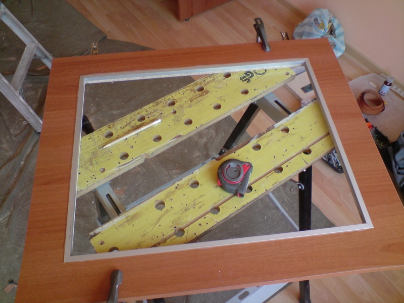 Сега към въпроса: Витринката е с размери 90х80 см. Двете вратички съответно са по 90х39,6. Реших като по-красиво вместо да правя рамките от по 4 тесни ивици и да ги слепвам, да изрежа отвор.