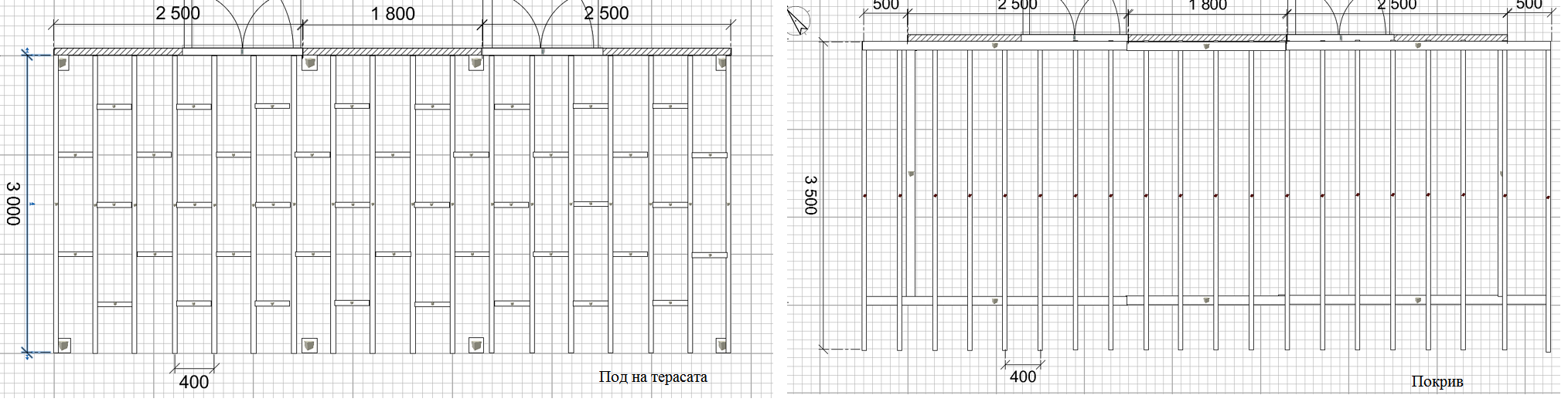 Терасата ще лежи на 8 бр. колони 15 х 15 см – 4 бр. отпред и 4 бр. отзад с височина 235 см, свързани с 6 бр. столици 15 х 10 см (три слепени греди 5х10 см), които ще бъдат съединени челно с Г-образно зарязване. Задните три броя ще бъдат захванати за стената посредством шпилки М12 през 1 м. Разстоянието между колоните ще е 250 см между крайните две и средните две колони и 180 см между средните две колони. Ще приложа чертеж малко по-надолу. Задните колони също ще са закрепени към стената (все още не съм решил как, но имам идеи) и ще стъпват върху крепеж, захванат с анкери към бетонната площадка и едната стъпка. Столиците ще бъдат свързани с ребра 5х10 см през 40см и между тях (ребрата) допълнително ще има връзка напречно с 5х10 греди шахматно. Върху ребрата ще има дъски с дебелина 2,5 см, ширина 25 см и дължина 4 м.