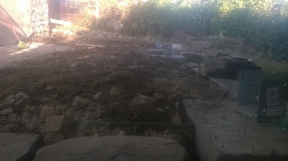 Споделям какво искам да направя това лято, а вие ми кажете къде имам пропуски или някъде греша. Сдобих се с къща миналото лято в Странджа планина, на която искам да построя тераса от иглолистно дърво (бор) с размери 6,8 на 3 метра. Същата ще бъде захваната за стената на къщата и ще има едноскатен покрив с наклон около 26% (150), покрит с хидроизолация и битумни керемиди. Стената, за която ще се захваща е в основата си каменен зид с височина 130 см и ширина около 50 см и нагоре е цяла тухла единичка (вижда се по-надолу от снимките). Основата на която ще стъпва терасата е основно пръс с малка денивелация, която почти нивелирах, като до къщата има излят фундамент около метър широк, 13 см дълбок и дълъг почти до края на къщата. Излял съм 5 броя бетонови стъпки, като отпред са 4 броя и една отзад с размери 35х35 см и дълбоки 60 см и с цокъл 45х40 см на различна височина (заради терена). Две от стъпките станаха с 50 см дълбочина, тъй като ударих на скала. Използвал съм готова суха бетонова смес, запълвах и с камъни, армирах с гладка арматура около сантиметър дебела и винкели (каквото имах под ръка), които са забити в дълбочина около 20-30 см (с изключение там, където ударих на твърда основа). Крепежите за четирите колони отпред са бетонирани в колоните.
