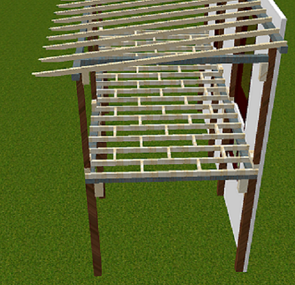 Отгоре конструкцията ще е идентична с тази разлика, че колоните и столиците ще са 10х10 см и може би няма да я има напречната шахматна връзка между ребрата. Височината на покрива ще е 260 см отзад и 180 см отпред. Предвидил съм сачак от около 50 см (или малко повече), зависи дали ще слагам улуци.