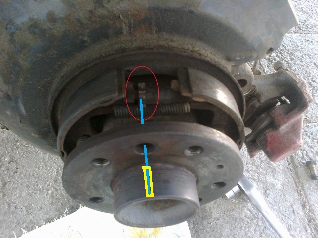 След това ще видите едно кръстато болче между дупките за болтовете на джантата,то е фиксиращо и се завива към полуоската,за да свалим диска то трябва да се развие.