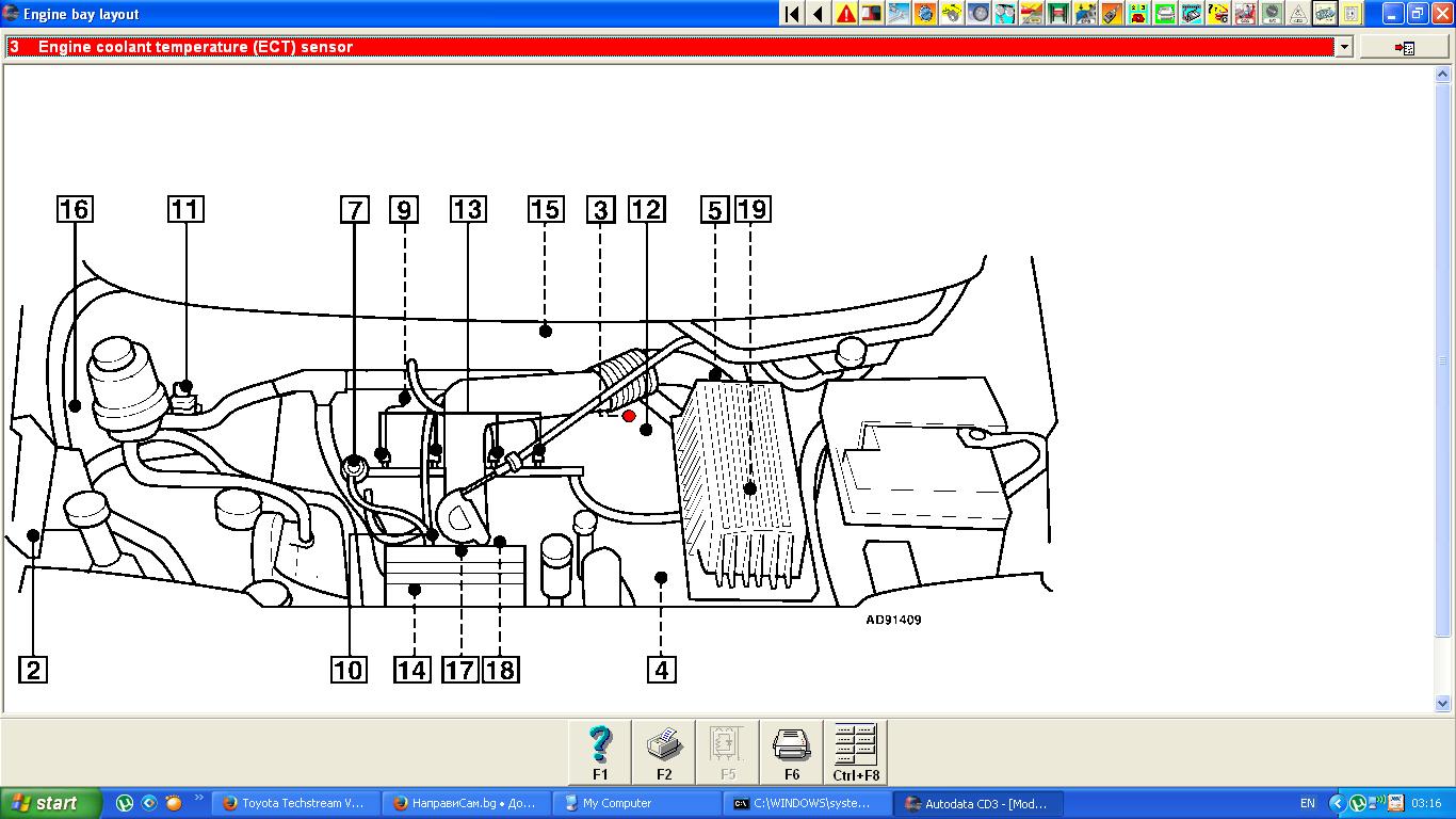 Та като гледам симптомите ми се струва че имаш проблем с температурния датчик/ци и/или окабеляването около него, но не този на радиатора. Намират се на малко кофти място. Като застанеш пред колата зад мотора от дясната страна на главата - номер 3 на картинката. Там обикновено е мазно и мръсно. Опича им се изолациите на кабелите и се напуква доста, оголва се на места и може да опира и окъсява. Имай в предвид ,че е напълно нормално при лъжливи показания на температурата оборотите да варират в широки граници и стъпковото да е здраво. Обикновено външно почистване и капка тънко масло или ВД на стъблото е достатъчно ако е здраво. Ваденето е излишно, защото няма как да го почистиш отвътре, а там си има грес, която от времето е засъхнала. Износено ли е ...