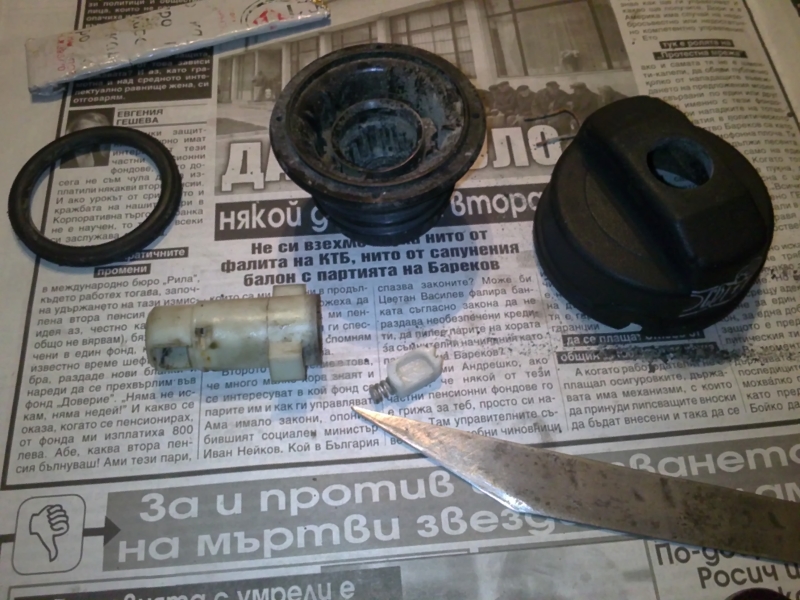 Оригиналното заключване на външния капак не работи и докато се постопли за да сваля пластмасовите кори на багажника и да монтирам вакуум машинка от бракувания пасат, се заиграх да оправя патрона за моя ключ. Много е лесен достъпа до резервоара, не че се точи лесно -има цедка и маркуча не влиза повече от 20см, но...