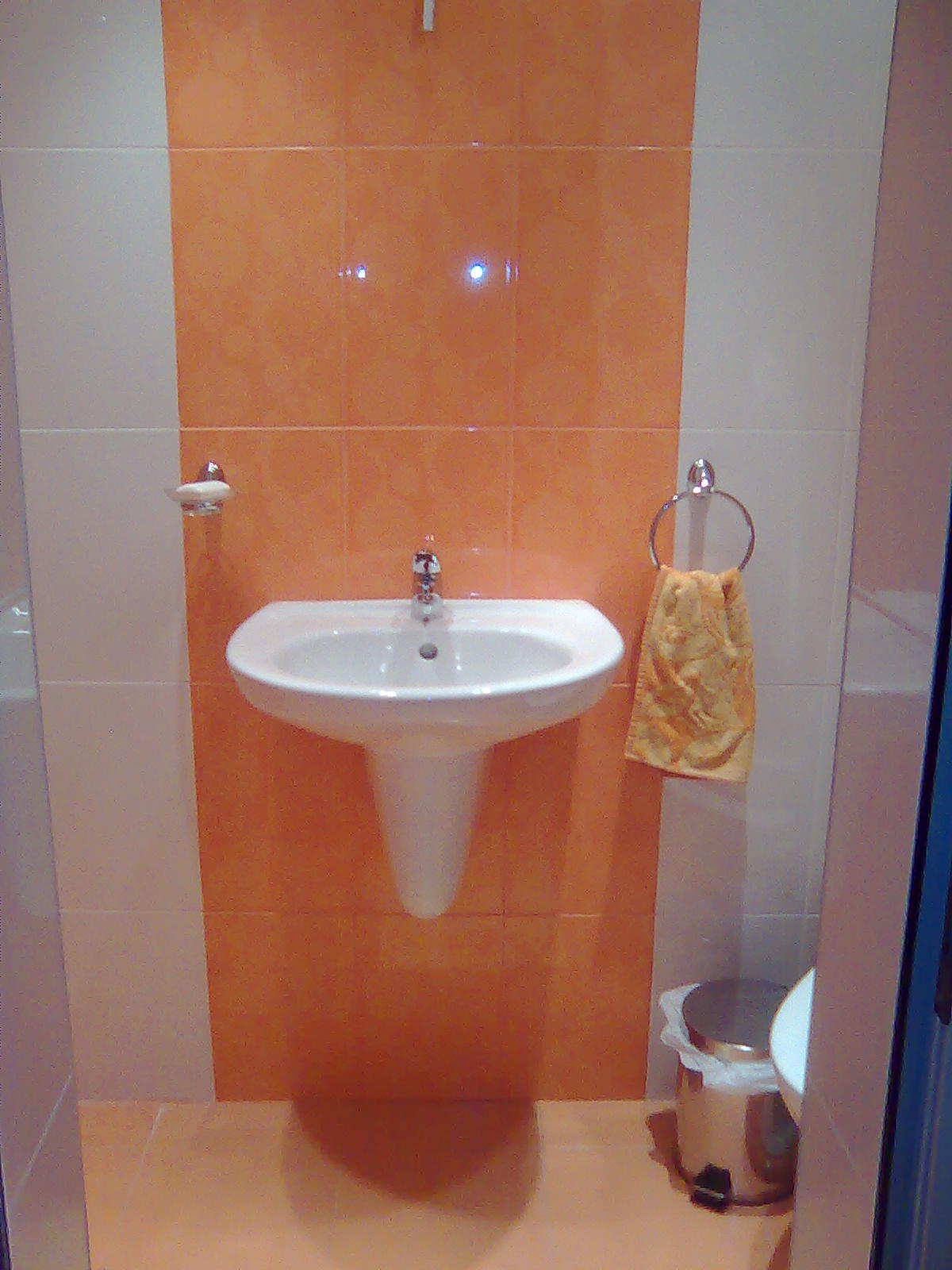 Здравейте, след направеният ремонт на банята реших и аз да кача някоя снимчица. Банята е с размери 1,90м дължина на 1,10м широчина. Реших да рискувам с оранжевият цвят комбиниран с белите мивка, моноблок, бели плочки и бял таван. Съчетанието с хромираните смесители, казанчета, аксесоари и лунички в крайна сметка доста ми хареса. Плочките са лепени върху гипсокартон, който е окачен. Вратата е бяла алуминиева. Сумата която заплатихме за банята + смяна на тръбите ( ППР) и смяна на тръбите на мръсният канал е около 2000 лева. Едната стена я преместих с 20 сантиметра за да я разширя.