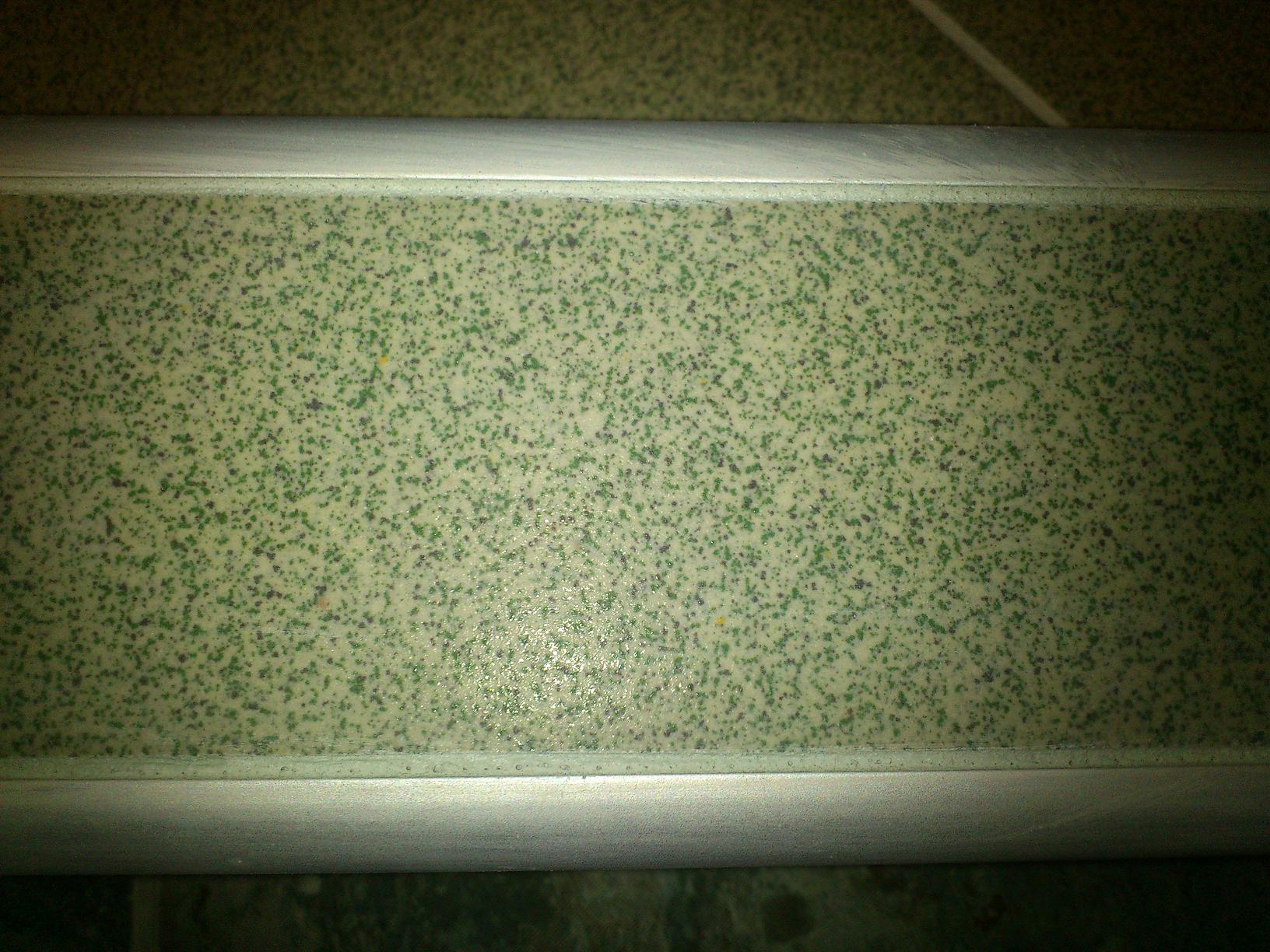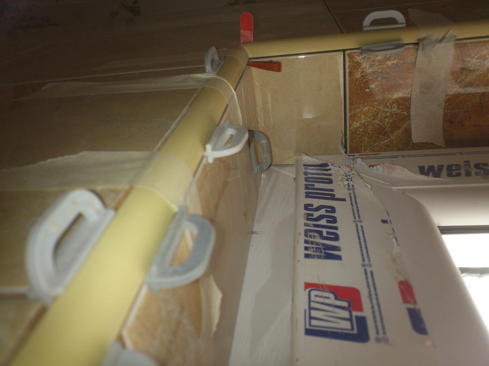 Промазваме с лепило(за плочки, друго в бани не ползваме) мястото, дето ще ляга лайсна. Слагаме лайсна и промазваме със шпакла или мистрията. В този случай лайсната се държи само от лепило и позволява по-лесно оформяне на парчетата за обръщане. В тази част на плочката, която е към лайсната се нанася допълнително лепило (на снимката попрекалих