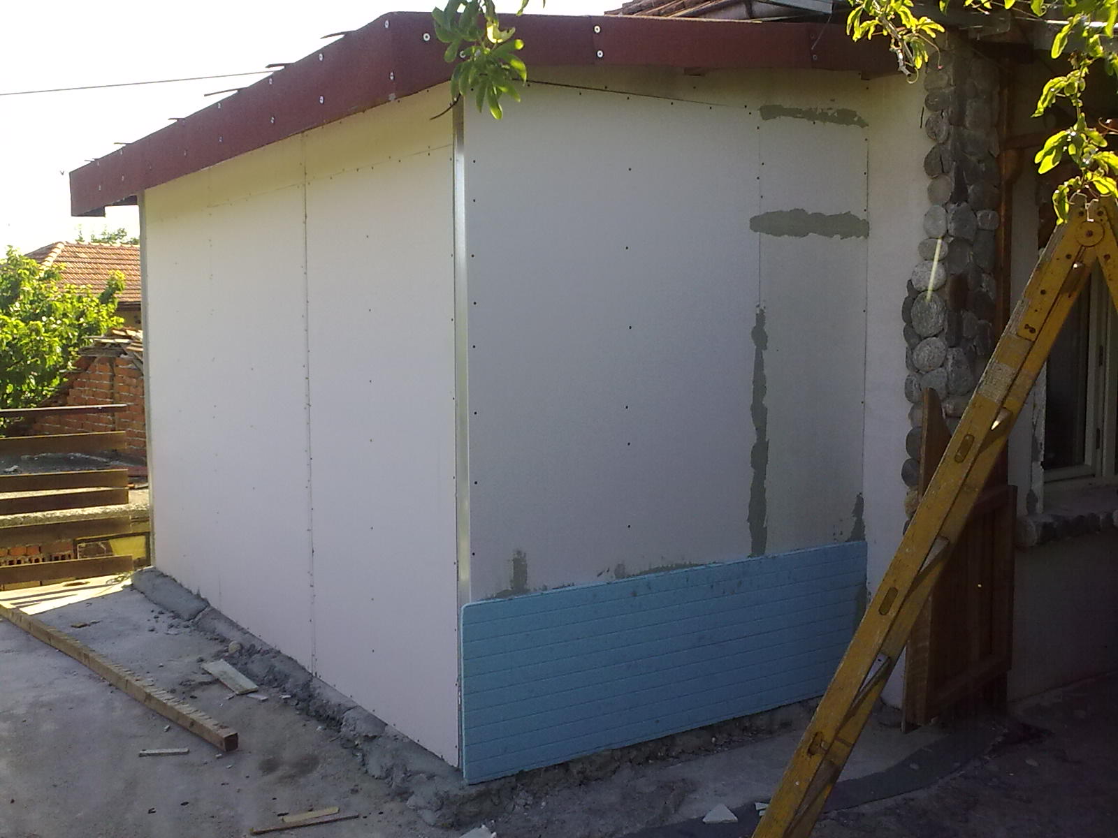 Мислих мислих и реших малко по малко да си направя баня.Ще опиша какво съм решил да правя.С червено са сифоните за обратната вода .Мисля да пробия първо 4 дупки в плочата трите фи 50 и 110 за тоалетната .слагам тръбите и в долната стая по тавана да минава тръба 110 която под секи сифон си има съответния преходник обира всички сифони и от там в ямата.След това мрежа замаска 5-6 санти.Мисля да направя една стабилна конструкция от дървени греди 10на10 през 60 зантиметра като ги анкерирам за плочата и стената на къщата.След това отвън гипсофазер,стереопор прекарвам през друга дупка зелената на чертежа ми в стената правата вода и тока от долу бойлера и той е долу слагам ватата зелен картон и плочки .За сега това ми е плана какво ще кажете?