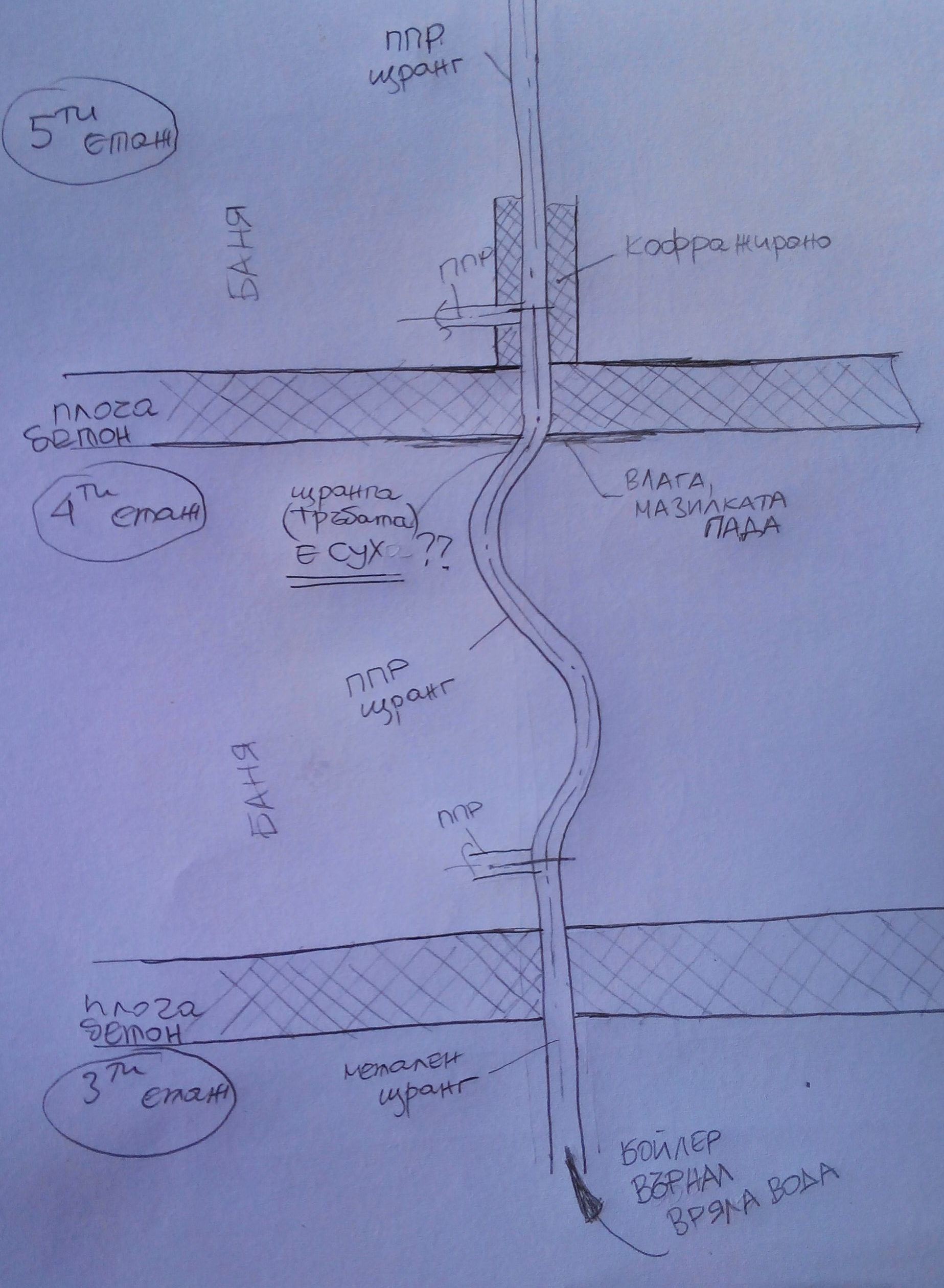 8. Сега теча почти е спрял или на моменти, на пипане щранга на 4ти етаж близо до тавана(плочата между 4ти и 5ти етаж) е сух