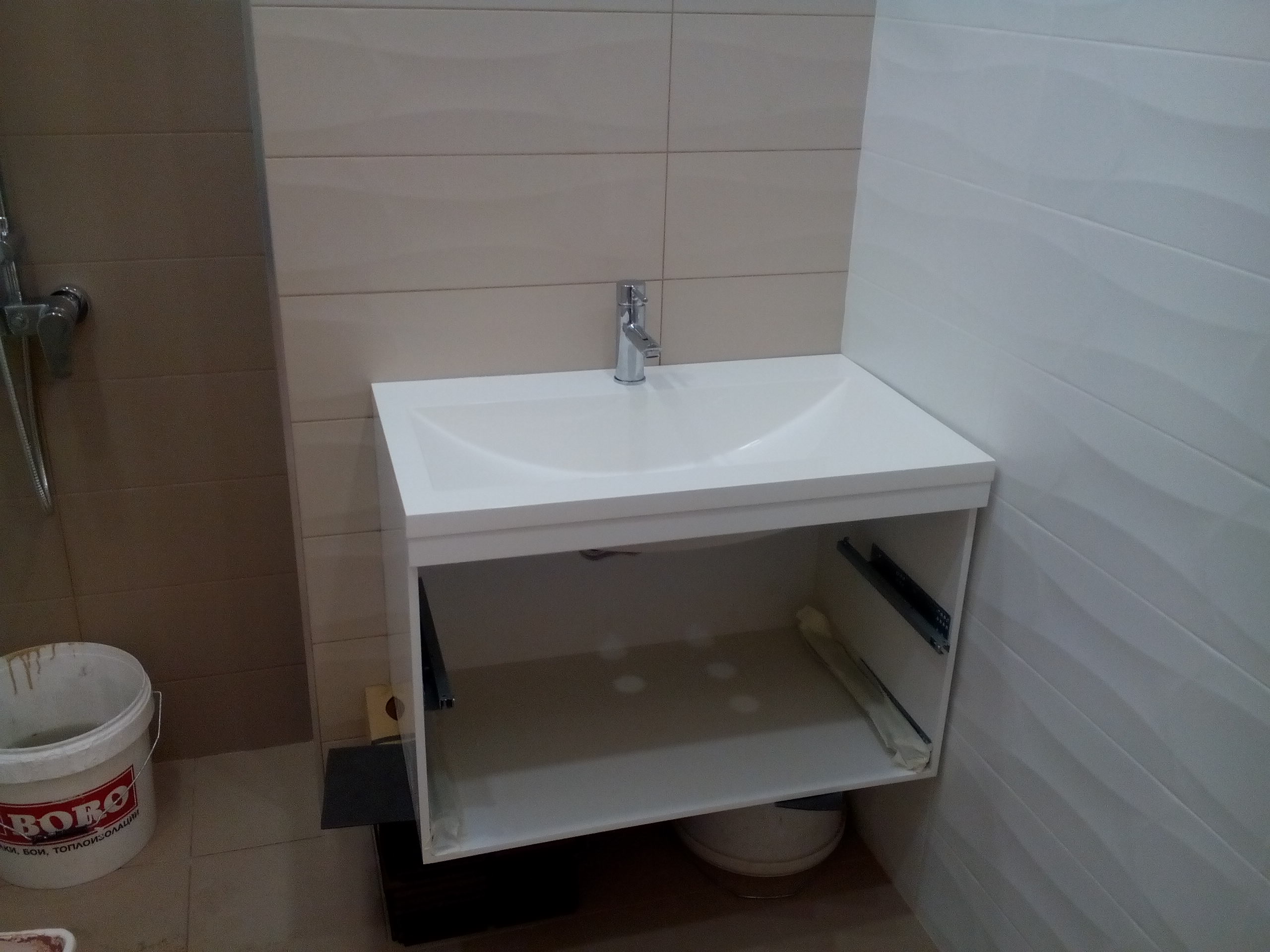 За мен, в момента най-лесното решение е - мивката седяща на шкафче за баня - ИКЕА са пълни с подобни, а за бойлера - метална рамка, хваната за пода с анкери и грундирана и боядисана с антикорозионна боя. Може и да не е много Фън Шуй, но се свиква и не се преправят вече платени работи :wink: