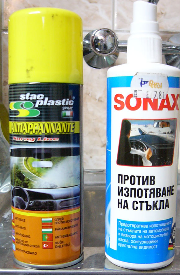 Не остават ли мазни следи след тези спрейчета? Аз пръскам, изчаквам, минавам с микрофибърна кърпа и после стъклата ми се замазват. Ползвам онова спрейче, което си дал лявото, Plastic нещо си. И ефектът му е точно след като напръскаш да няма изпотяване, но е краткотраен.