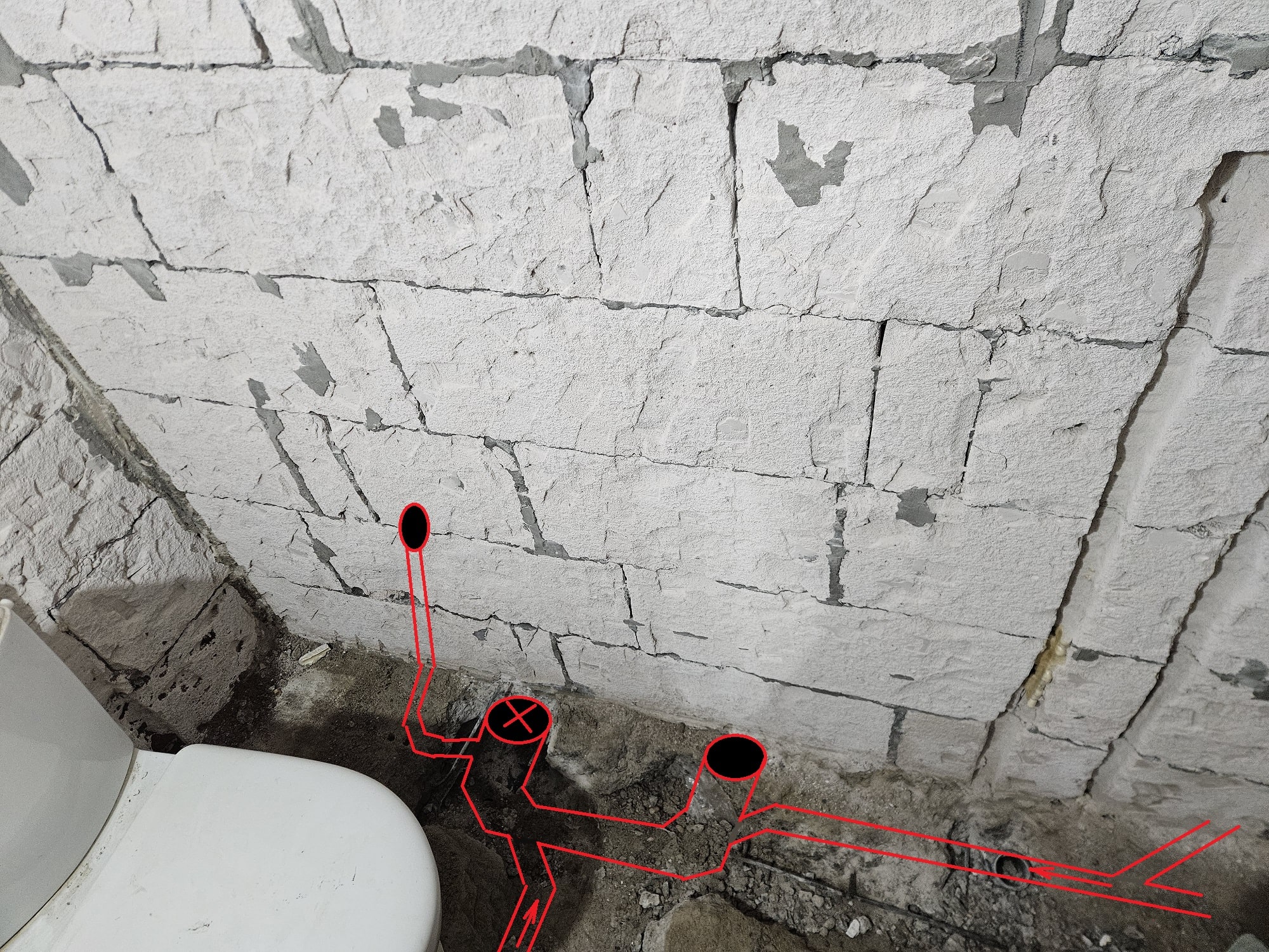 Ето разпределението и близък план на сегашната тръба, която идва от тоалетната. Мисля да я извадя там, където е последната наставка.