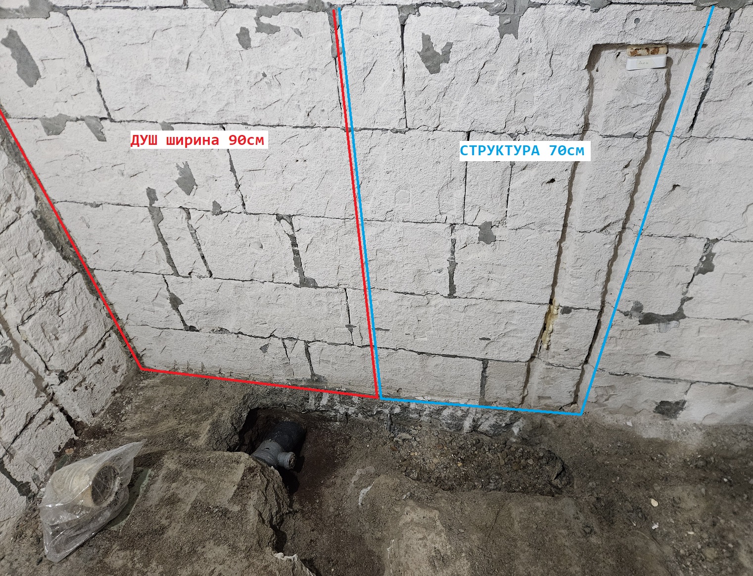 От ляво ще има пералня, от дявно мивка и сифон на душ, а срещуположно идва канал от кухня (мивка и миялня).