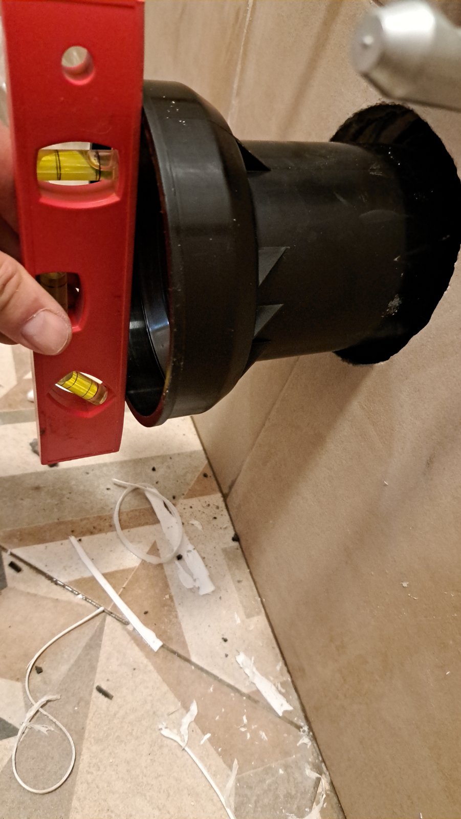 На снимката е видно, как чакащата в структурата тръба е изведена с обратен наклон, в следствие на което при пускане на водата избива вода навън. Има ли начин да се оправи, без разрушаване на плочките и гипсокартона? Марката структура е Grohe.