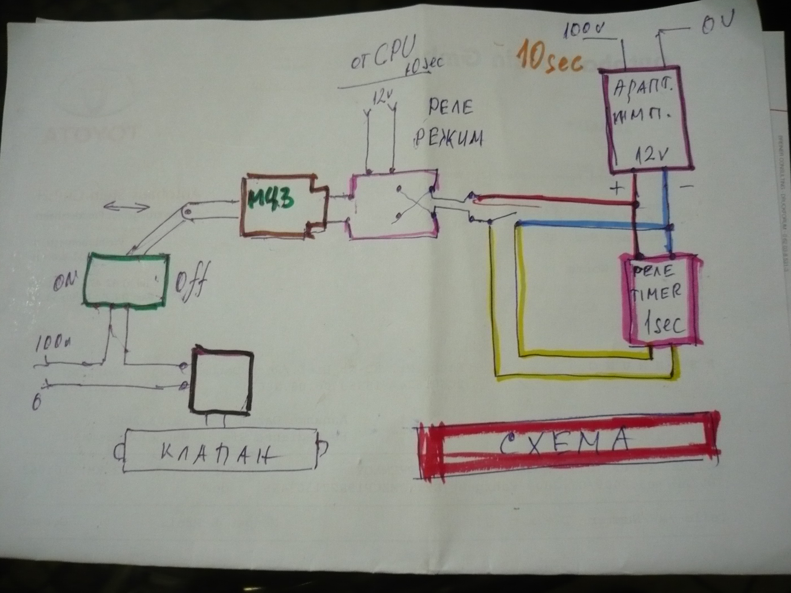Колеги наистина ,не успях да хвана тоя дефрост но, явно температурите навън и вътре не са със същественна разлика и ...не се нуждае от дефрост а и гледам под другия /Тошко(toshiba)/ е сухо...Ето и скицичката по която сътворих всичко...с адаптера 100-12V захраних един модул централно заключване/МЦЗ/който се комутира от "реле режим"със смяна на поляритета -изхвърляйки и прибирайки се той вкл. и изкл.чрез един превключвател бобината на четирипътния клапан. Релето за време 1сек.използвам за да се абстрахирам от 10-те сек.подавани от процесора а и толкова и дори по-малко са необходими за изхвърляне или прибиране на МЦЗ.В режим комутация или т.н. смяна на режим консумацията е макс.80-90мА.Тия дни ще отворя капака и ще снимам монтажа ,заради пробите се наложи да защипя пак трите реда кечета , изолации и...