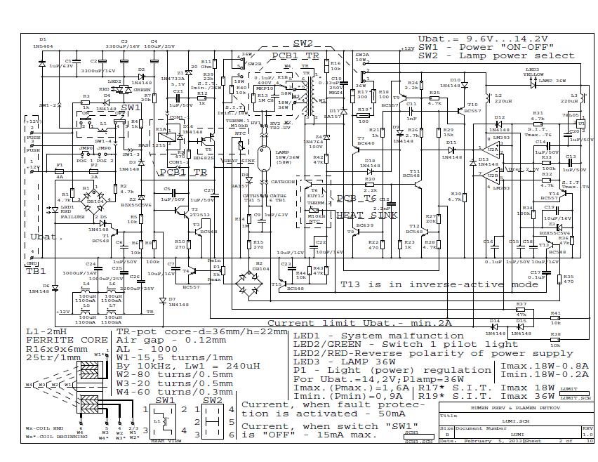 LED1 свети при късо съединение между извод “TB2-HV” и +12V. Светването на LED1 и блокиране на преобразователя е след изтичане времето за старт. Схемата блокира до изключване от SW1. Ако късото съединение се появи след изтичане на времето за старт блокирането е незабавно.