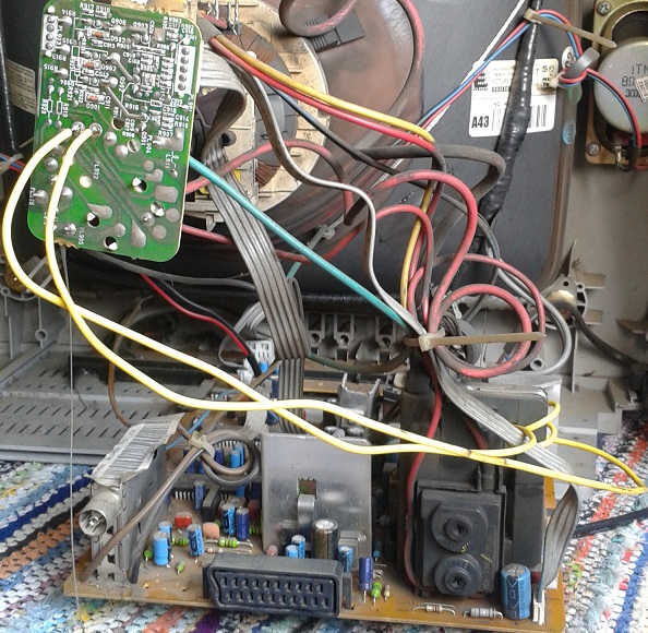 горе на кинескопа Изводите на кинескопа не трябва да контактуват с платката.Запояваш краищата на кабела за изводите. Или по неговия вариант май е по лесно .