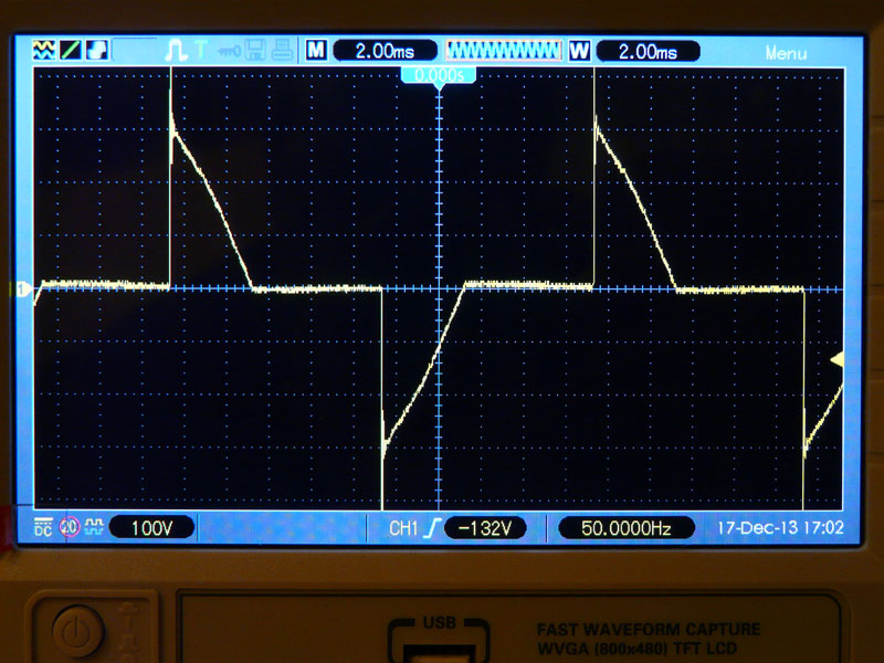 А за регулатора освен да направиш една проба и да видиш как ще работи(като мощност) и дали няма да грее мотора, щото ето такава "синусоида" се получава след регулатора(с триак) при около 110V: