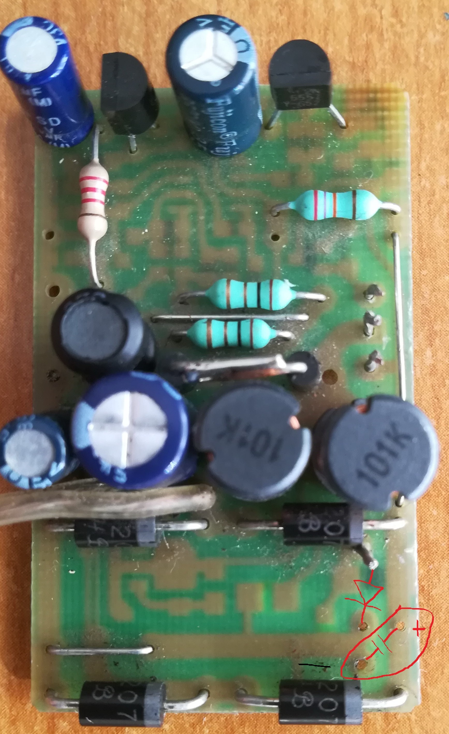 Сега като се загледах освен кондензатора липсва и още един елемент. Крачето което стърчи е дебело колкото това на диодите. Мисля си че е имало някакъв диод. Лошото е, че не мога да намеря снимка в нета за да възстановя всичко. Предполагам е нещо такова: