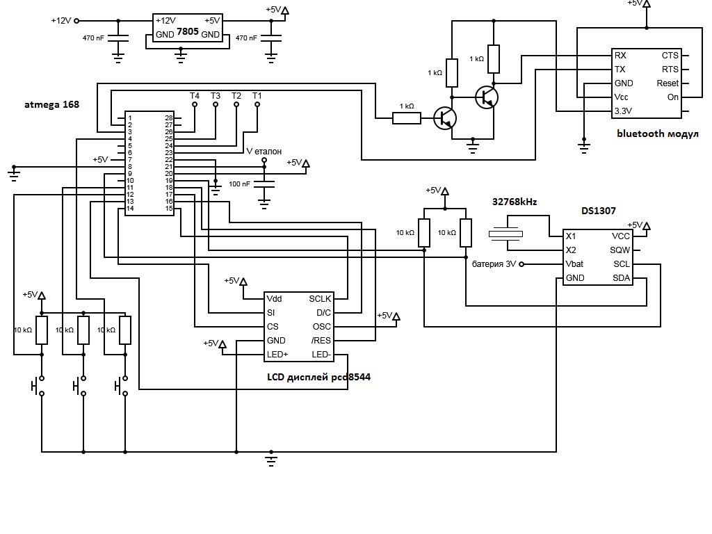 Изградена е от един микроконтролер Atmega168PA, LCD дисплей от стар GSM(мобифон) и bluetooth модул от стар касов апарат и I2C realTime чип DS1307