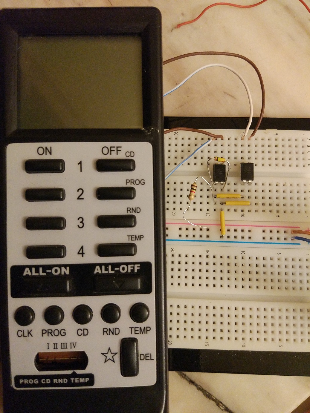 Използвам оптрона вместо реле за да включвам ръчно този дистанционен ключ за осветление понеже с релето се получаваше индукция по кабелите и се самоизключваше.