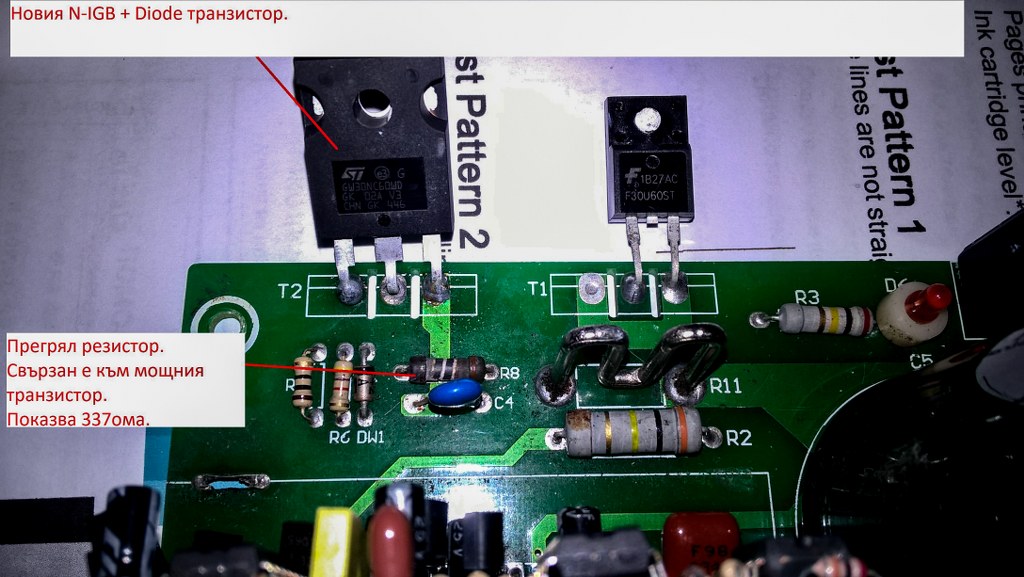 На главната платка беше изгърмял предпазния бушон, мощния N-IGB+D транзистор беше тотално окъсил, точно пред него има прегрял резистор с неясни фабрични параметри ( в момента показва 330 ома), имаше изгорял диод D2 4007.