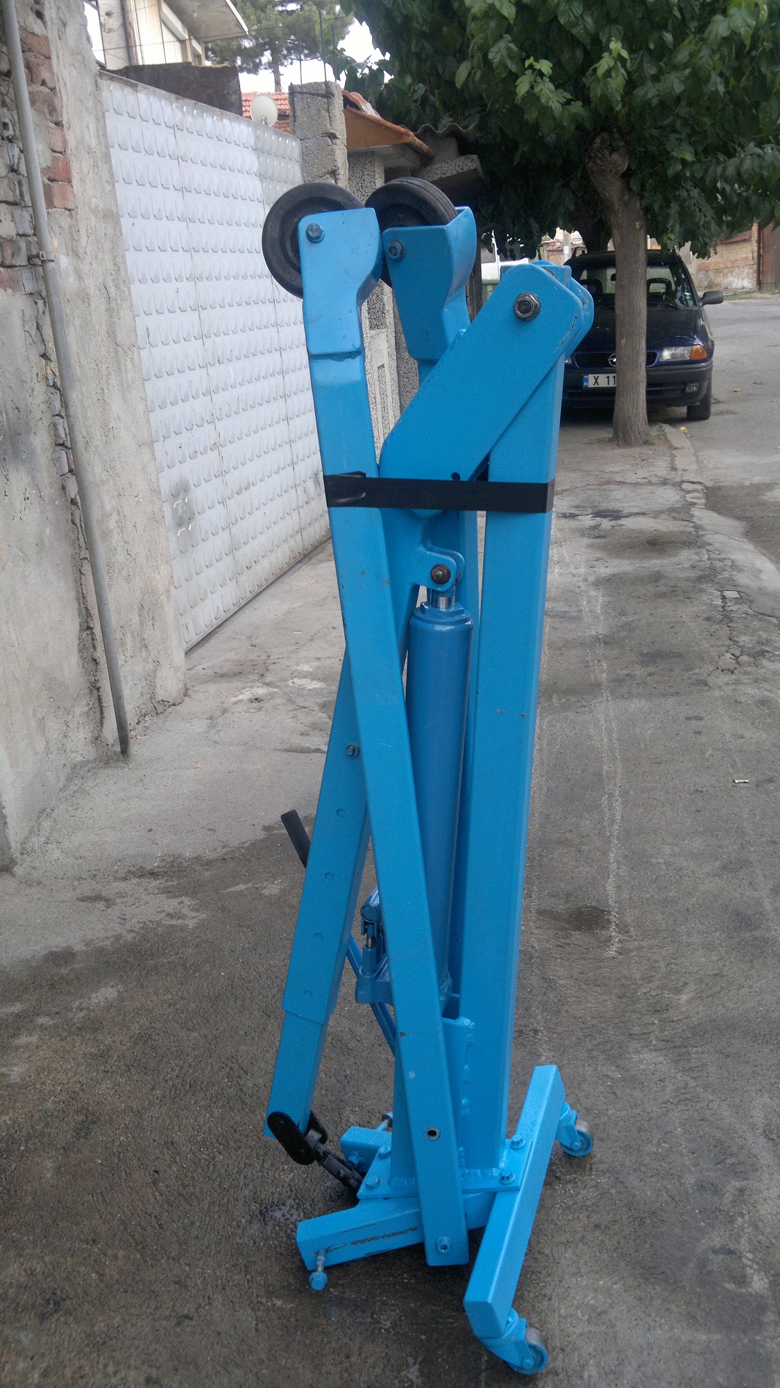 Браво за изработката. Имам само една забележка.Долу двата крака не се захващат така само с по два болта.Трябва самите профили на краката да влизат вътре във други профили защото при евентуална по-голяма тежест болтовете се срязват и всичко се озовава на земята.Щом казваш, че бутилката струва 140лв изработката се обезмисля.В момента един такъв жирав чисто нов е 200лв.