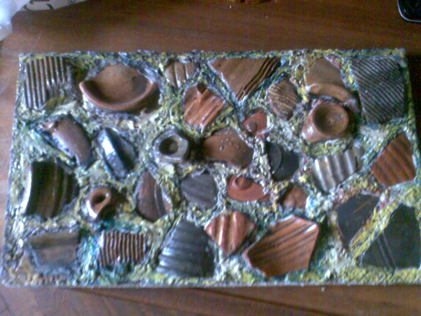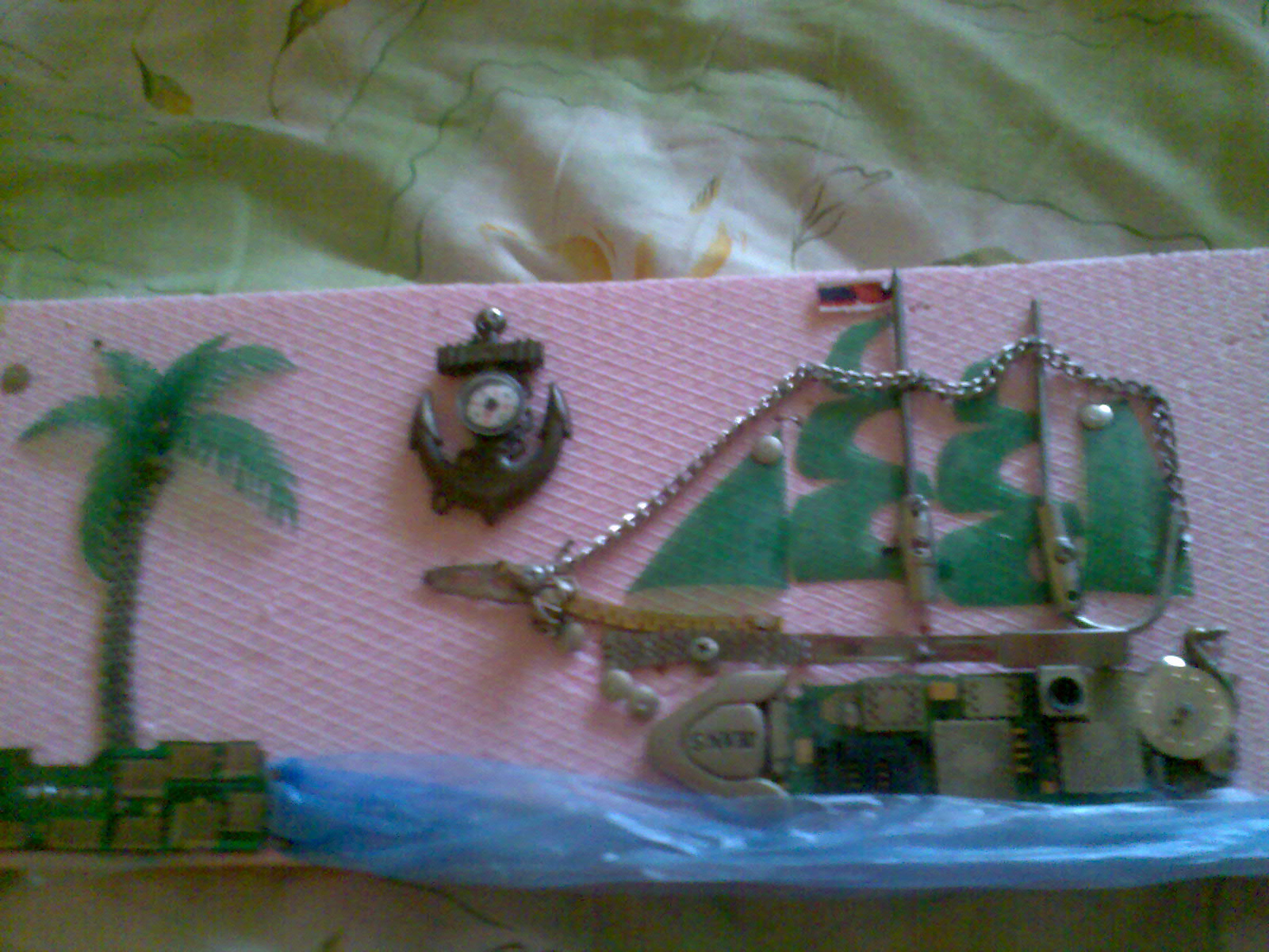 първо моята гордост-поставка за бижута от един панел стиропор ,в дупката на които вкарах огледало и прикачих няколко парчета изолация върху които съм набола малки пирончета после минах ръбовете с един кант перде и малко габърчета.След това -игленик от перде и малко дунапрен,пано от парченца римски съдове,рамка от капачки кунс,и един кораб от стар джиесем пласмасова бутилка и разни други джаджи
