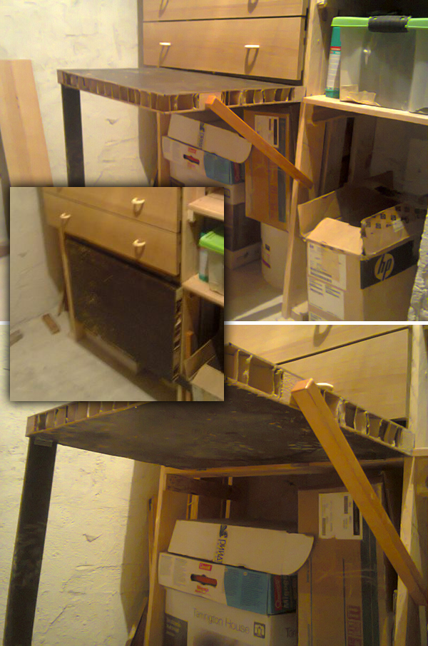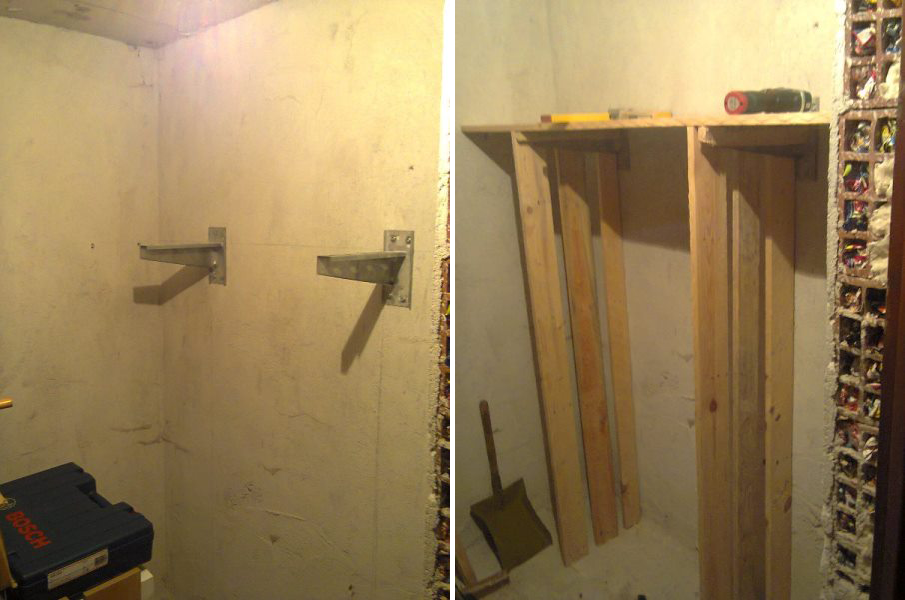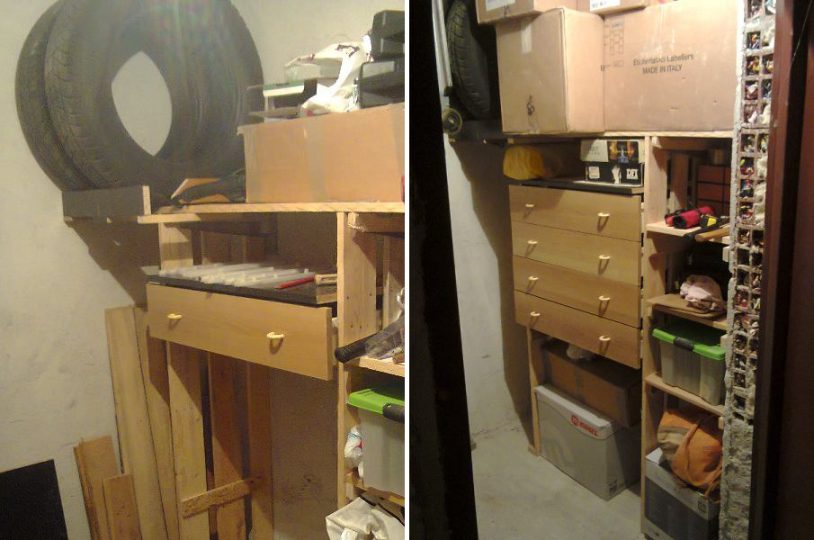 Става въпрос за рафтове с материали от 2 палета, останали ми чекмеджета от бебешки скрин който си смени предназначението, 2 стенни носача за кабелни скари, малко дюбели и винтове.