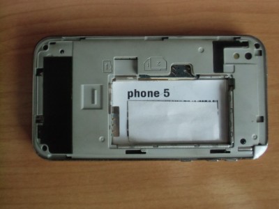 Брат ми не ползва този айфон/ако е такъв и той толкова може да ми обясни/ и ми го даде. Батерията му я няма,защото я дал в Пловдив по нея да направят поръчка ,но сега магазина го нямало там. Така без батерия днес обиколи 4 магазина в базар Илиянци,един на бул Левски и ул Шишман,никъде няма такъв размер. Само в Илиянци едно момче се опита с подобна батерия ,която за 2 мм не може да влезне по ширина в леглото,да докосне с контактите на батерията ,контактите на айфона и го включи.Екрана светна и се появи някакво лого,но не можа да задържи батерията така и екрана угасна. Не знам дали може да се разшири ,като се махне ламаринката ,но размери гнездото са 57 Х 32 Х 4 мм. Отпред са три извода.
