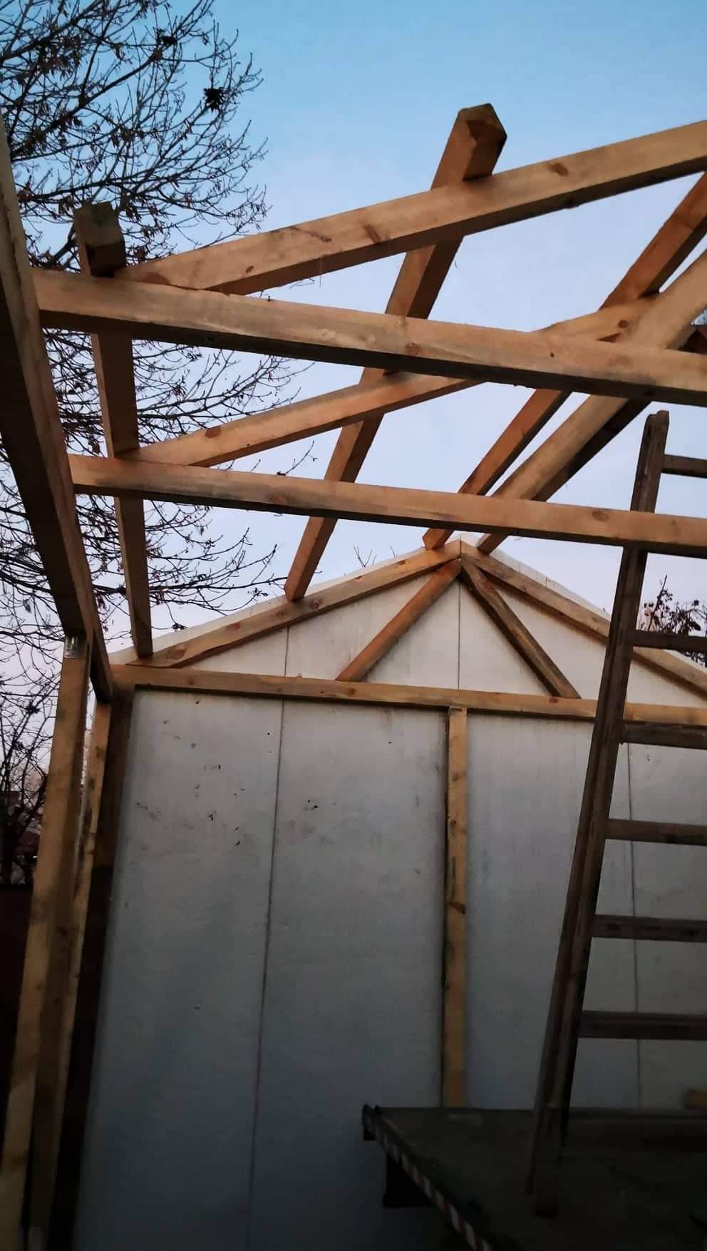 Явно малко съм избързал, но и времето ме притиска. "Строежа" напредна. В средата на лява и дясна стена горе и долу има двойни греди. Остава да направя диагонали на задната стена, да довърша фермите и да облека конструкцията. След което врати, прозорец и т. н.