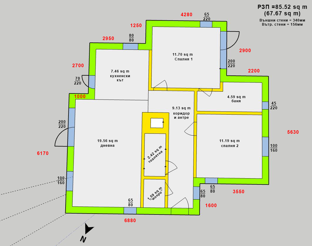 Естествено - отворен съм към съвети и критики от по-вещите. Ясно ми е, че по-разчупената форма неминуемо осложнява, но пък не е прекалена, според мен. Отбелязал съм чисти квадратури на помещенията, дебелина на стените, размери на прозорци, а в червено е дължината на външните стени. Големите 200/220 прозорци са реално плъзгащи врати.