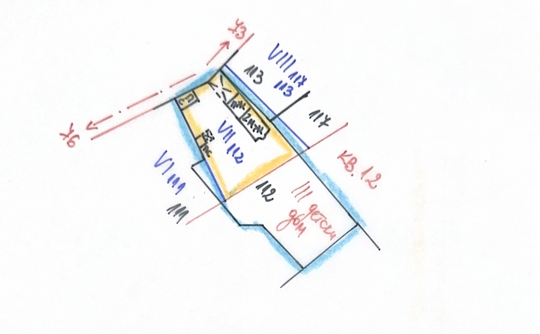 Какви са тия удебелени пастелени линии в жълто и синьо? Червена линия през средата на имота? "Детски дом"?