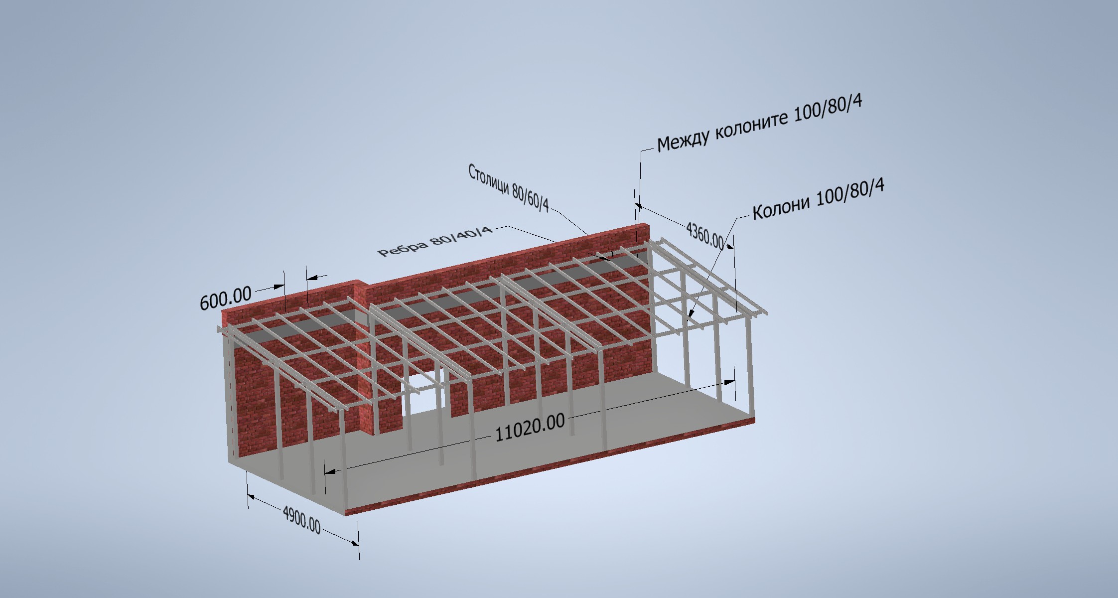 Здравейте. Планирам ремонт на покрив на пристройка на къща, с цел пригаждане за жилищно ползване. Показаното се явява плоча над първи етаж, стената е границата на къщата. Прикачвам металната конструкция, която обмислям. Бягам от монолит за да си спестя излишен товар върху основи и плоча. Между ребрата вата отдолу картон и още вата. Върху ребрата ще има дъсчена обшивка, мембрана, летва, контралетва и метална керемида. Между колоните ще иззидам тухлен зид (ъгли и ръбове ще бъдат запенени) който ще вържа на места с арматура към металната конструкция ( или евентуални някакъв циментфазер отвън, вата и отвътре картони и т.н.) Нямам височина, затова и се спирам на 8 градуса наклон.