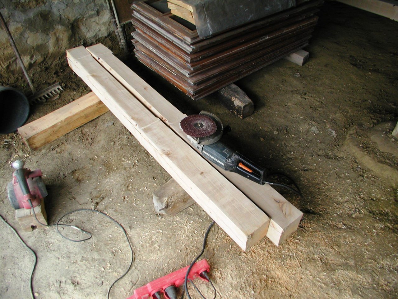 Тази колона която се има предвид при поставянето на въпроса, остава зазидана в предната стена, така че не и трябва нищо. Обаче, положението с всички видими колони е различно. Пипвам ги по малко. Но нещо повече. Състарявам дървото. Следите от гатера са грозна работа. Стоят много зле по видимите части. Заради това съм принуден, по-скоро да състарявам, отколкото да разкрасявам дървото. Обработвам всички видими части, които са близо до погледа на човек. Това ще рече че освен всички колони, състарявам и няко греди. Например тези на стълбата и всички хоризонтални около нея, покрай които ще се минава постоянно. Работата е много тегава, защото бука е твърд и не се обработва лесно. За да залича следите от гатера, първо минавам с флекса с шкурка 24. След това с четката която се вижда. Бавна и сръткава работа, която наистина ми идва в повече.