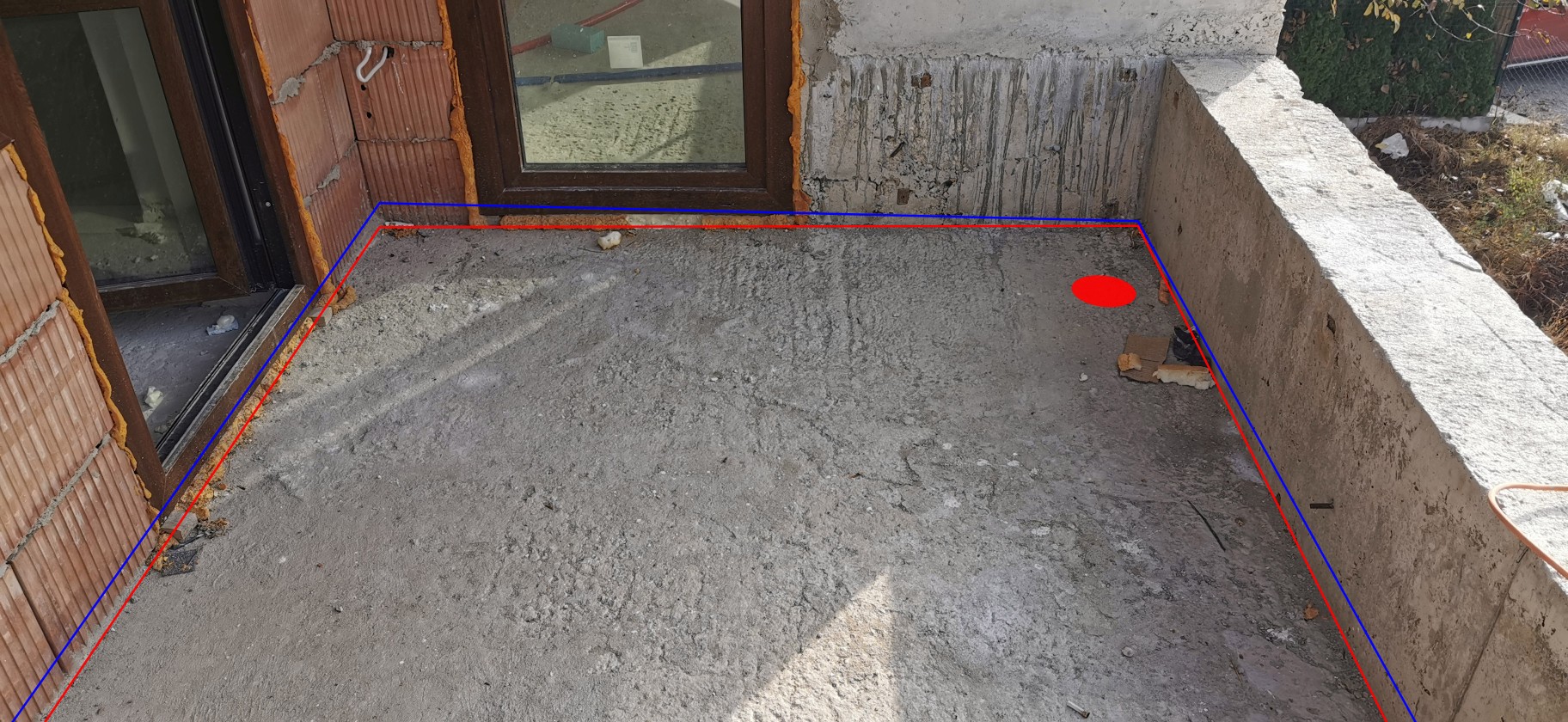 1. Какъв тип изравнителна замазка е подходяща за моя случай за да мога да докарам наклон за 3,5 м от края на терасата до сифона и отивайки към вратите същевременно да мога да запазя минимална дебелина за да се впиша в около 4см? На схемата се виждат позициите на вратите и сфиона.